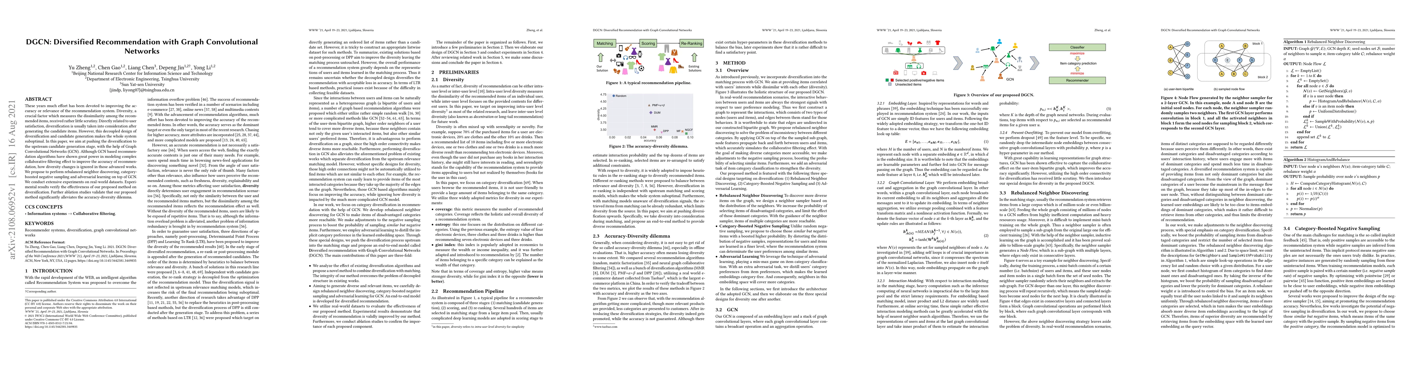 This paper proposes DGCN, a method that integrates diversification into the candidate generation stage using Graph Convolutional Networks (GCN) to improve recommendation system performance. The approach includes rebalanced neighbor discovering, category-boosted negative sampling, and adversarial learning to enhance both accuracy and diversity, validated through extensive experiments on real-world datasets.