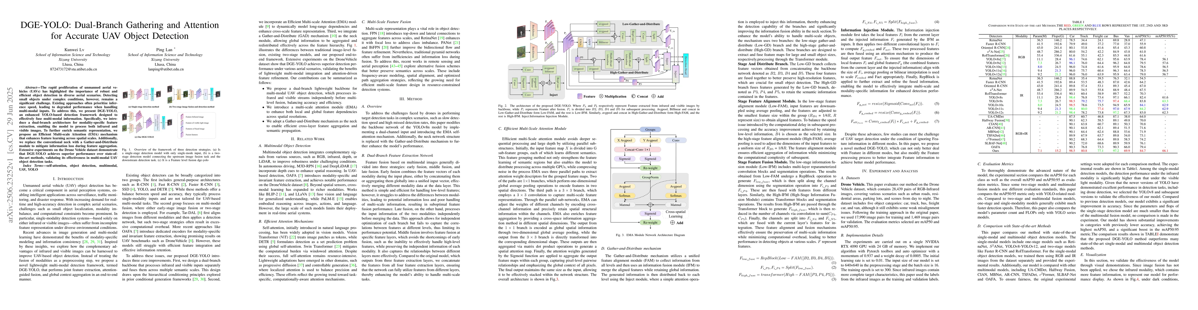 The rapid proliferation of unmanned aerial vehicles (UAVs) has highlighted the importance of robust and efficient object detection in diverse aerial scenarios. Detecting small objects under complex conditions, however, remains a significant challenge. Existing approaches often prioritize inference speed, leading to degraded performance when handling multi-modal inputs. To address this, we present DGE-YOLO, an enhanced YOLO-based detection framework designed to effectively fuse multi-modal information. Specifically, we introduce a dual-branch architecture for modality-specific feature extraction, enabling the model to process both infrared and visible images. To further enrich semantic representation, we propose an Efficient Multi-scale Attention (EMA) mechanism that enhances feature learning across spatial scales. Additionally, we replace the conventional neck with a Gather-and-Distribute module to mitigate information loss during feature aggregation. Extensive experiments on the Drone Vehicle dataset demonstrate that DGE-YOLO achieves superior performance over state-of-the-art methods, validating its effectiveness in multi-modal UAV object detection tasks.