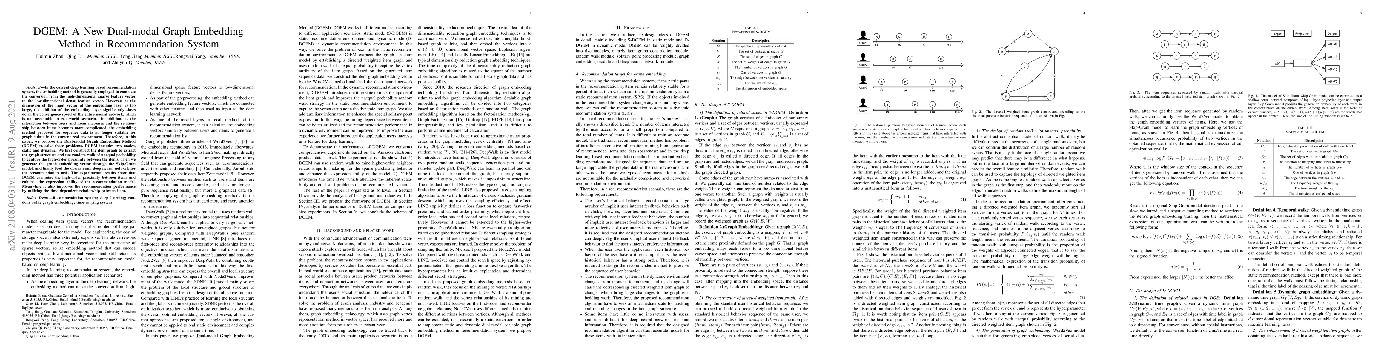 In the current deep learning based recommendation system, the embedding method is generally employed to complete the conversion from the high-dimensional sparse feature vector to the low-dimensional dense feature vector. However, as the dimension of the input vector of the embedding layer is too large, the addition of the embedding layer significantly slows down the convergence speed of the entire neural network, which is not acceptable in real-world scenarios. In addition, as the interaction between users and items increases and the relationship between items becomes more complicated, the embedding method proposed for sequence data is no longer suitable for graphic data in the current real environment. Therefore, in this paper, we propose the Dual-modal Graph Embedding Method (DGEM) to solve these problems. DGEM includes two modes, static and dynamic. We first construct the item graph to extract the graph structure and use random walk of unequal probability to capture the high-order proximity between the items. Then we generate the graph embedding vector through the Skip-Gram model, and finally feed the downstream deep neural network for the recommendation task. The experimental results show that DGEM can mine the high-order proximity between items and enhance the expression ability of the recommendation model. Meanwhile it also improves the recommendation performance by utilizing the time dependent relationship between items.