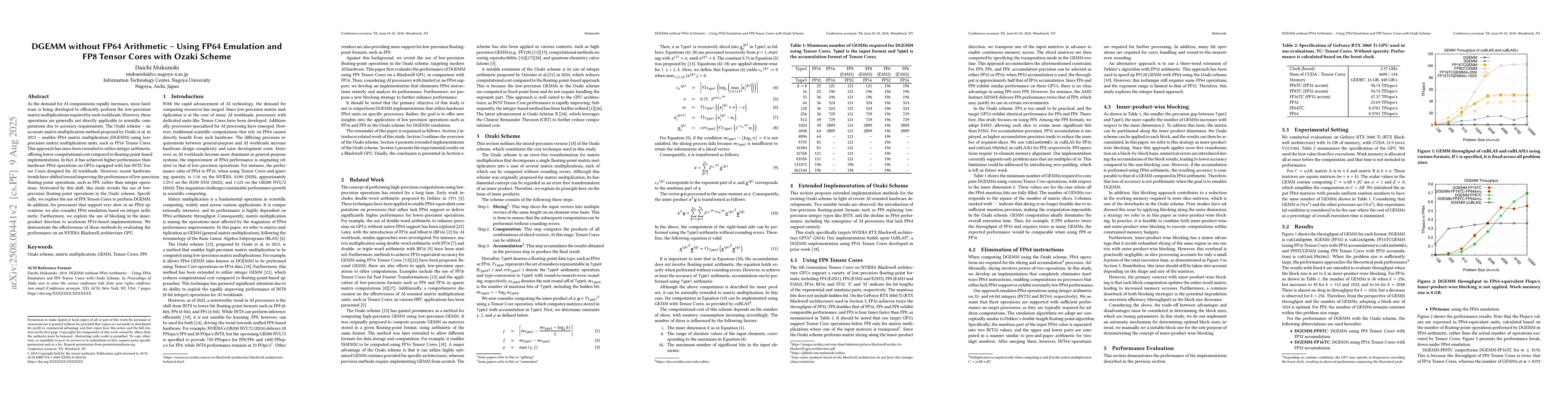 Since AI computations require low-precision matrix multiplications, processors with enhanced performance for these operations are increasing along with the growing demand for AI computations. However, it is difficult to use these operations directly for scientific computations. The Ozaki scheme, an accurate matrix multiplication method proposed by Ozaki et al. in 2012, enables FP64 matrix multiplication (DGEMM) using low-precision floating-point operations such as FP16. The method was subsequently extended to utilize integer arithmetic. The use of integer operations reduces computational cost compared to the floating-point based approach. It has also demonstrated higher performance than hardware FP64 operations on GPUs with fast INT8 Tensor Cores for AI workloads. However, the latest hardware tends to enhance low-precision floating-point operation performance such as FP8 instead of INT8. This study revisits the utilization of low-precision floating-point operations in the Ozaki scheme, considering the latest AI hardware. Specifically, we consider the use of FP6 and FP8 Tensor Cores. Moreover, for processors that support very slow FP64 operations or do not support them at all, we consider the use of the FP64 emulation based on integer arithmetic. We also examine a new blocking strategy. We demonstrate the effectiveness of these methods by evaluating the performance of DGEMM using FP8 Tensor Cores and FP64 emulation on a Blackwell architecture GPU.