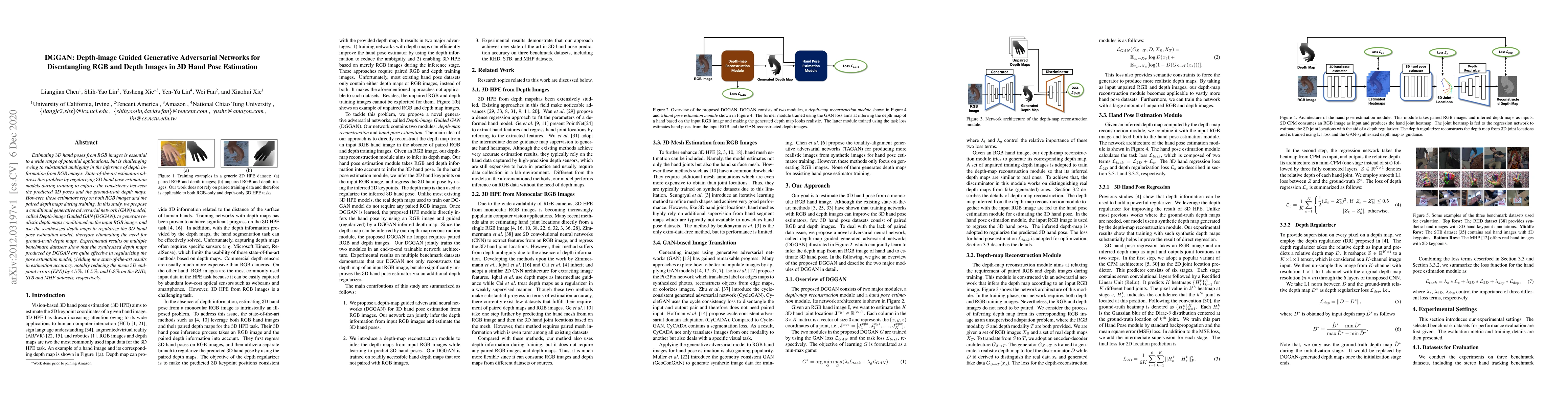 Estimating3D hand poses from RGB images is essentialto a wide range of potential applications, but is challengingowing to substantial ambiguity in the inference of depth in-formation from RGB images. State-of-the-art estimators ad-dress this problem by regularizing3D hand pose estimationmodels during training to enforce the consistency betweenthe predicted3D poses and the ground-truth depth maps.However, these estimators rely on both RGB images and thepaired depth maps during training. In this study, we proposea conditional generative adversarial network (GAN) model,called Depth-image Guided GAN (DGGAN), to generate re-alistic depth maps conditioned on the input RGB image, anduse the synthesized depth maps to regularize the3D handpose estimation model, therefore eliminating the need forground-truth depth maps. Experimental results on multiplebenchmark datasets show that the synthesized depth mapsproduced by DGGAN are quite effective in regularizing thepose estimation model, yielding new state-of-the-art resultsin estimation accuracy, notably reducing the mean3D end-point errors (EPE) by4.7%,16.5%, and6.8%on the RHD,STB and MHP datasets, respectively.