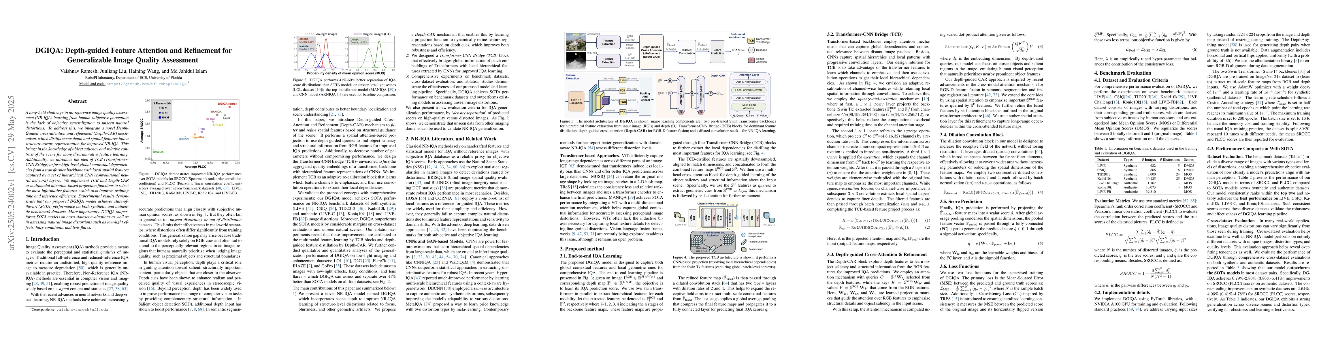This research is significant as it addresses the challenge of lack of objective generalization to unseen natural distortions in NR-IQA learning. By integrating a novel Depth-Guided cross-attention and refinement (Depth-CAR) mechanism, it distills scene depth and spatial features into a structure-aware representation for improved NR-IQA, bringing in object saliency and relative contrast knowledge of the scene for more discriminative feature learning.