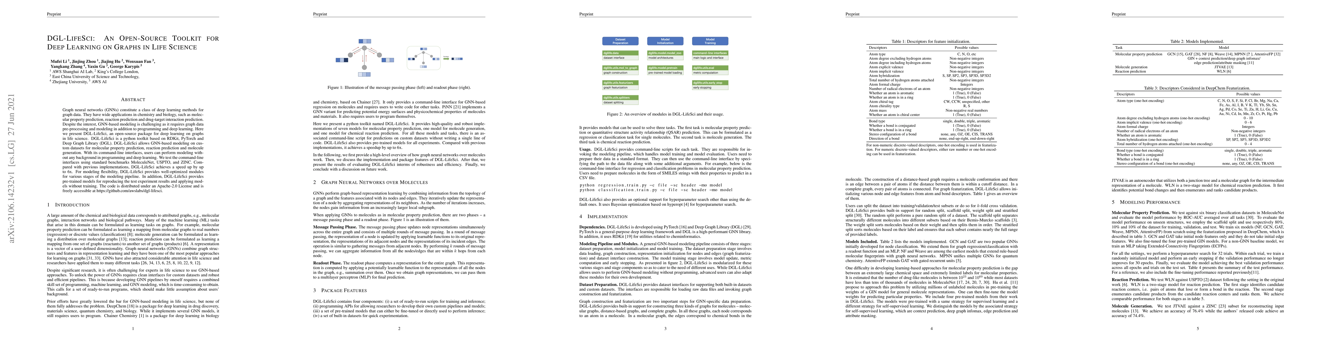 DGL-LifeSci is an open-source Python toolkit for deep learning on graphs in life science, leveraging RDKit, PyTorch, and DGL to simplify GNN-based modeling for tasks like molecular property prediction. It offers command-line interfaces and pre-trained models, achieving up to 6x speed improvements over previous implementations.