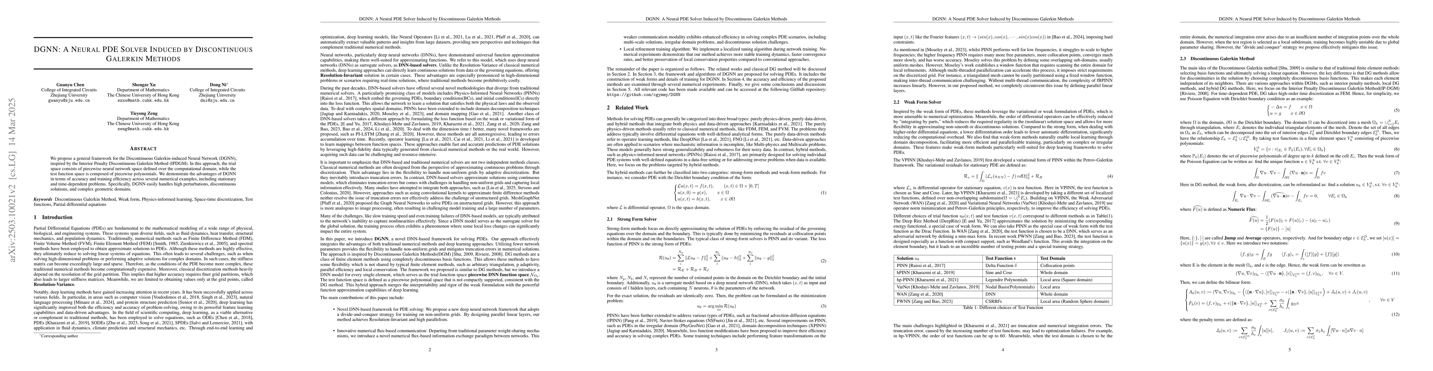The paper proposes DGNN, a neural PDE solver inspired by the Interior Penalty Discontinuous Galerkin Method (IPDGM). DGNN uses piecewise neural network spaces for trial functions and piecewise polynomials for test functions, demonstrating advantages in accuracy and training efficiency for various numerical examples, including stationary and time-dependent problems.