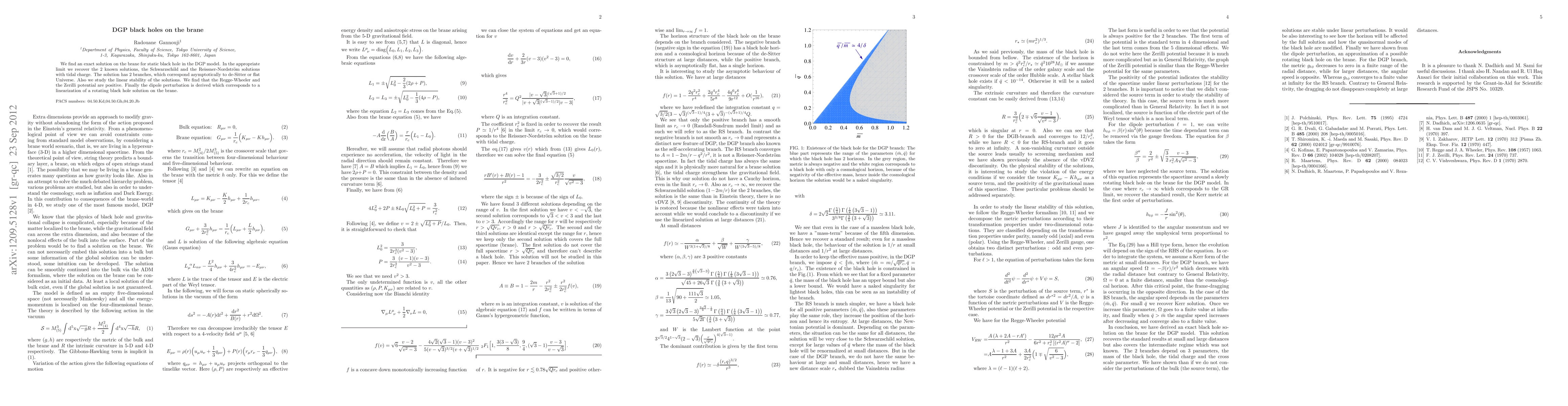 This paper presents an exact static black hole solution on the brane in the DGP model, recovering known Schwarzschild and Reissner-Nordstrom solutions with tidal charge. The solution exhibits two branches corresponding to de-Sitter or flat asymptotic universes, with positive Regge-Wheeler and Zerilli potentials indicating linear stability.