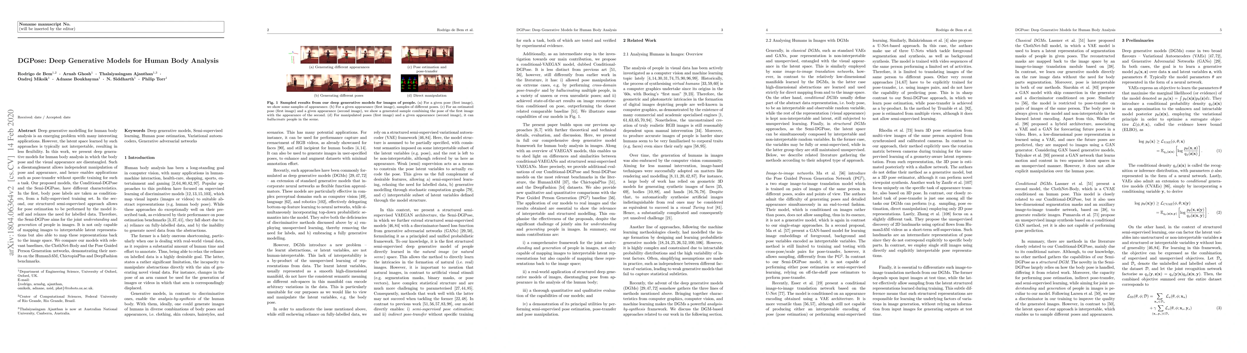 Deep generative modelling for human body analysis is an emerging problem with many interesting applications. However, the latent space learned by such approaches is typically not interpretable, resulting in less flexibility. In this work, we present deep generative models for human body analysis in which the body pose and the visual appearance are disentangled. Such a disentanglement allows independent manipulation of pose and appearance, and hence enables applications such as pose-transfer without specific training for such a task. Our proposed models, the Conditional-DGPose and the Semi-DGPose, have different characteristics. In the first, body pose labels are taken as conditioners, from a fully-supervised training set. In the second, our structured semi-supervised approach allows for pose estimation to be performed by the model itself and relaxes the need for labelled data. Therefore, the Semi-DGPose aims for the joint understanding and generation of people in images. It is not only capable of mapping images to interpretable latent representations but also able to map these representations back to the image space. We compare our models with relevant baselines, the ClothNet-Body and the Pose Guided Person Generation networks, demonstrating their merits on the Human3.6M, ChictopiaPlus and DeepFashion benchmarks.