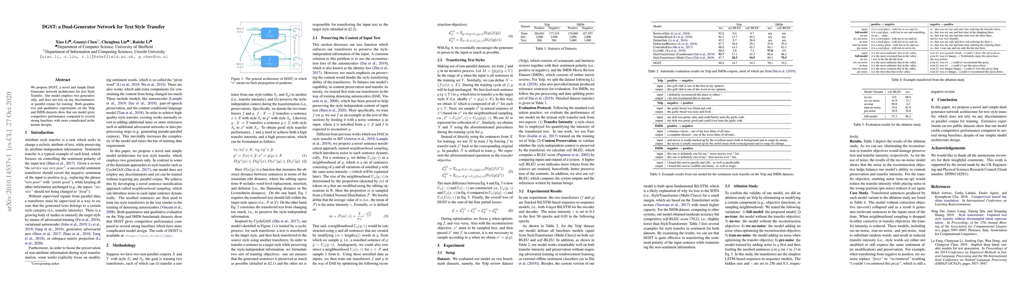 A new Dual-Generator network architecture called DGST achieves competitive text style transfer performance without using discriminators or parallel corpora. This simple model outperforms more complex baselines on Yelp and IMDb datasets.