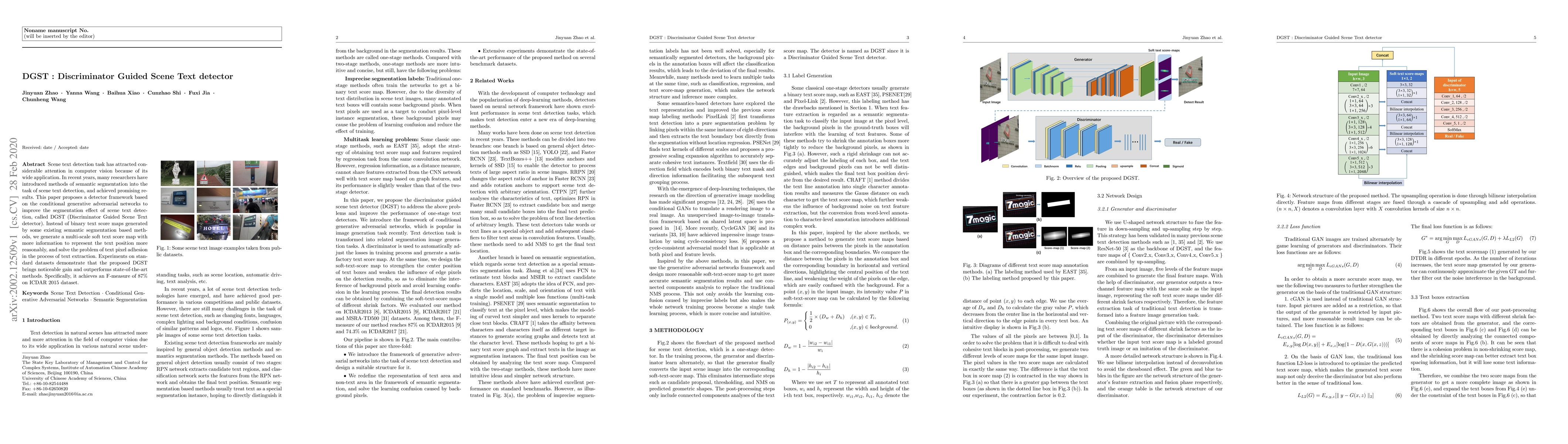 The paper introduces DGST, a Discriminator Guided Scene Text detector framework that leverages conditional generative adversarial networks to enhance scene text detection through multi-scale soft text score maps, achieving an F-measure of 87% on the ICDAR 2015 dataset and outperforming existing methods.