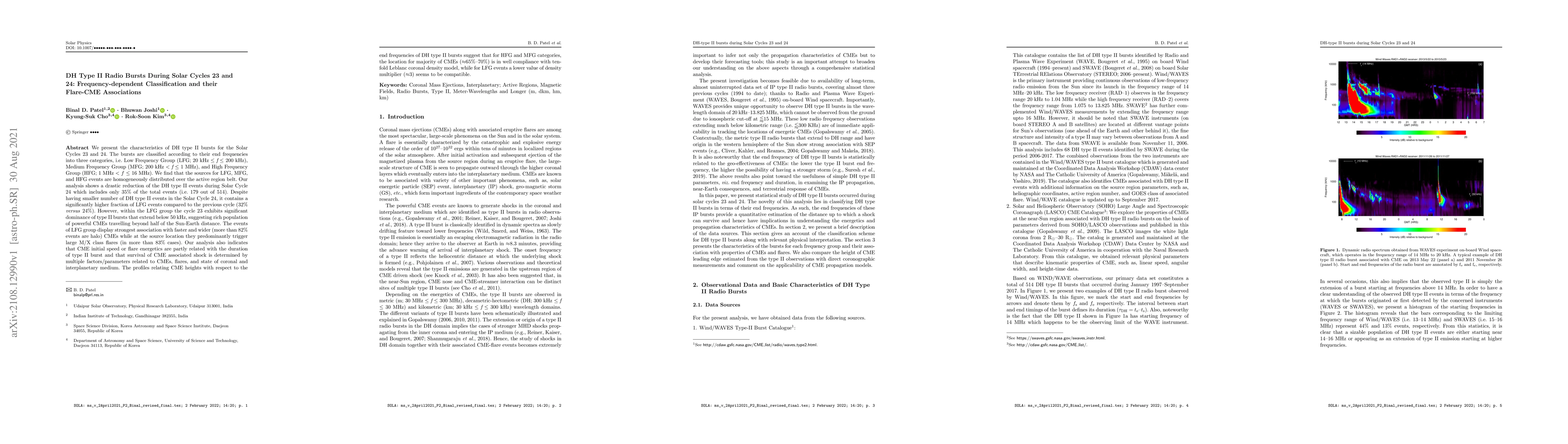 This study classifies DH type II radio bursts for Solar Cycles 23 and 24 into three frequency groups and finds a significant reduction in events during Cycle 24, with a notable increase in low-frequency bursts. The low-frequency group strongly correlates with faster, wider CMEs and large flares, while higher frequency groups show a better fit to the ten-fold Leblanc coronal density model.