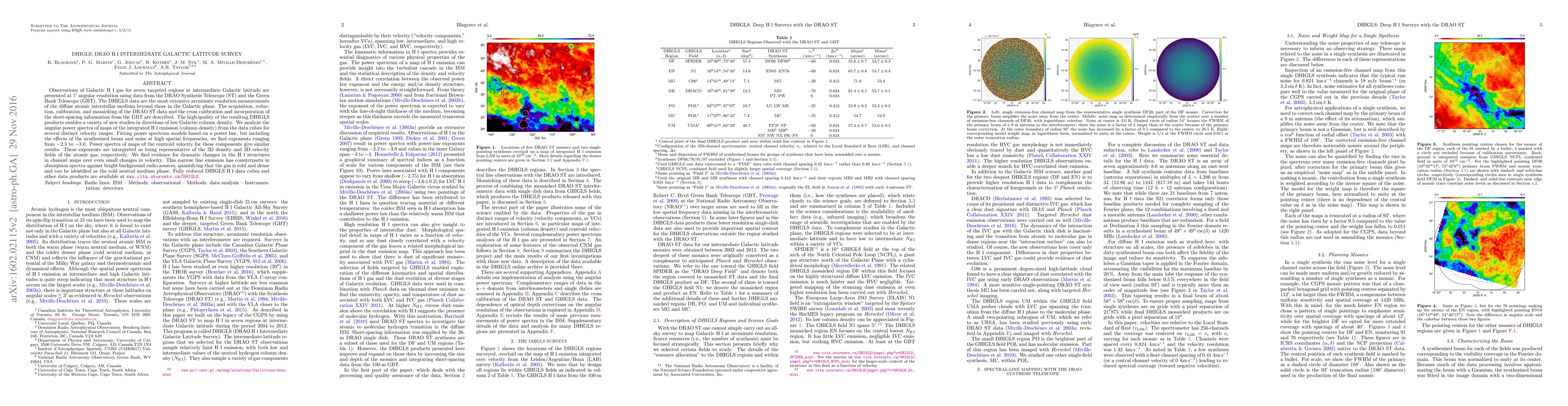 The DHIGLS survey presents high-resolution observations of Galactic H I gas at intermediate latitudes using data from the DRAO ST and GBT, revealing detailed structures of the diffuse atomic interstellar medium. The study finds power spectrum exponents ranging from -2.5 to -3.0, indicating the 3D density and velocity fields of the cold neutral medium, and highlights significant changes in H I structures with small velocity shifts.