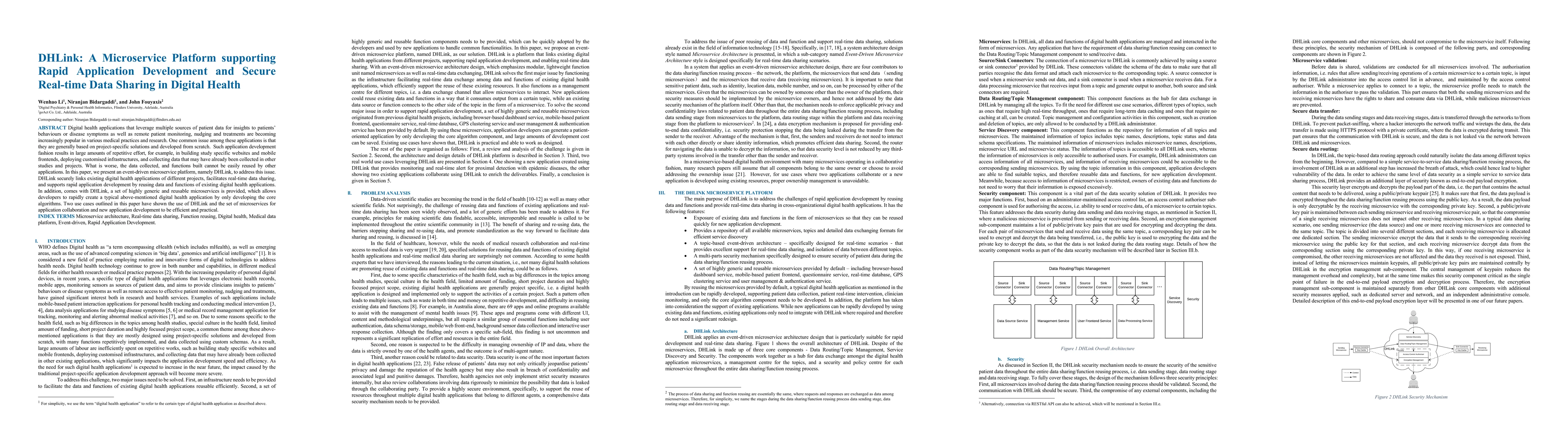 Digital health applications that leverage multiple sources of patient data for insights to patients' behaviours or disease symptoms as well as remote patient monitoring, nudging and treatments are becoming increasingly popular in various medical practices and research. One common issue among these applications is that they are generally based on project-specific solutions and developed from scratch. Such application development fashion results in large amounts of repetitive effort, for example, in building study specific websites and mobile frontends, deploying customised infrastructures, and collecting data that may have already been collected in other studies and projects. What is worse, the data collected, and functions built cannot be easily reused by other applications. In this paper, we present an event-driven microservice platform, namely DHLink, to address this issue. DHLink securely links existing digital health applications of different projects, facilitates real-time data sharing, and supports rapid application development by reusing data and functions of existing digital health applications. In addition, comes with DHLink, a set of highly generic and reusable microservices is provided, which allows developers to rapidly create a typical above-mentioned digital health application by only developing the core algorithms. Two use cases outlined in this paper have shown the use of DHLink and the set of microservices for application collaboration and new application development to be efficient and practical.