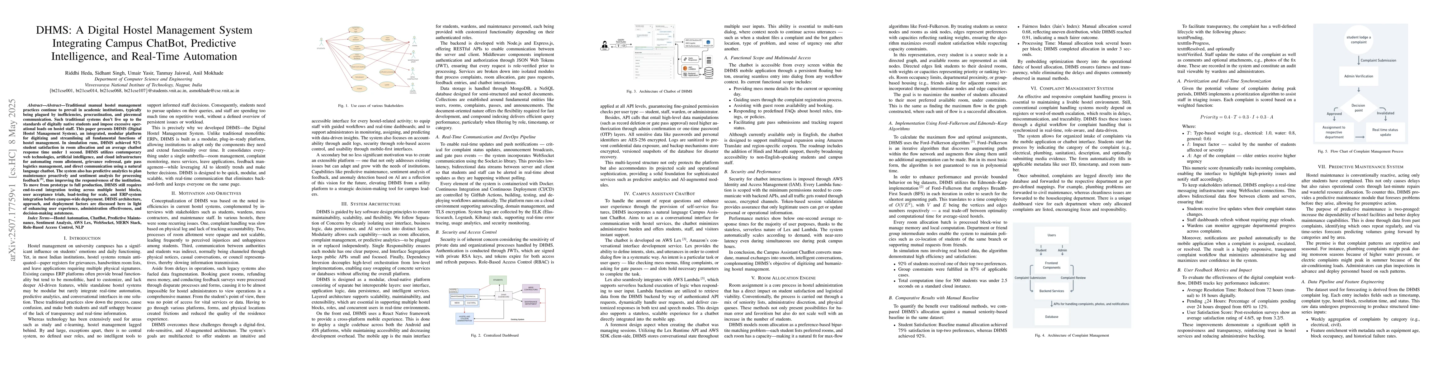 Traditional hostel management practices in academic institutions often suffer from inefficiencies, delays, and fragmented communication. These systems fail to meet the expectations of digitally native students and place a significant operational burden on hostel staff. This paper introduces DHMS (Digital Hostel Management System), a modular and integrated platform designed to digitize and streamline essential hostel management functions. DHMS leverages modern web technologies, artificial intelligence, and cloud infrastructure to automate room allotment, grievance redressal, gate pass logistics, and communication via a natural language chatbot. In simulation tests, DHMS achieved a 92% student satisfaction rate in room allocation and maintained an average chatbot response time below one second. Additional features include predictive analytics for proactive maintenance planning and sentiment analysis for feedback processing. While promising, the system requires further testing for integration across multiple hostel blocks, user acceptance, scalability under load, and ERP compatibility before campus-wide deployment. This work discusses the system architecture, implementation approach, and factors critical to improving user experience, administrative efficiency, and decision-making processes.