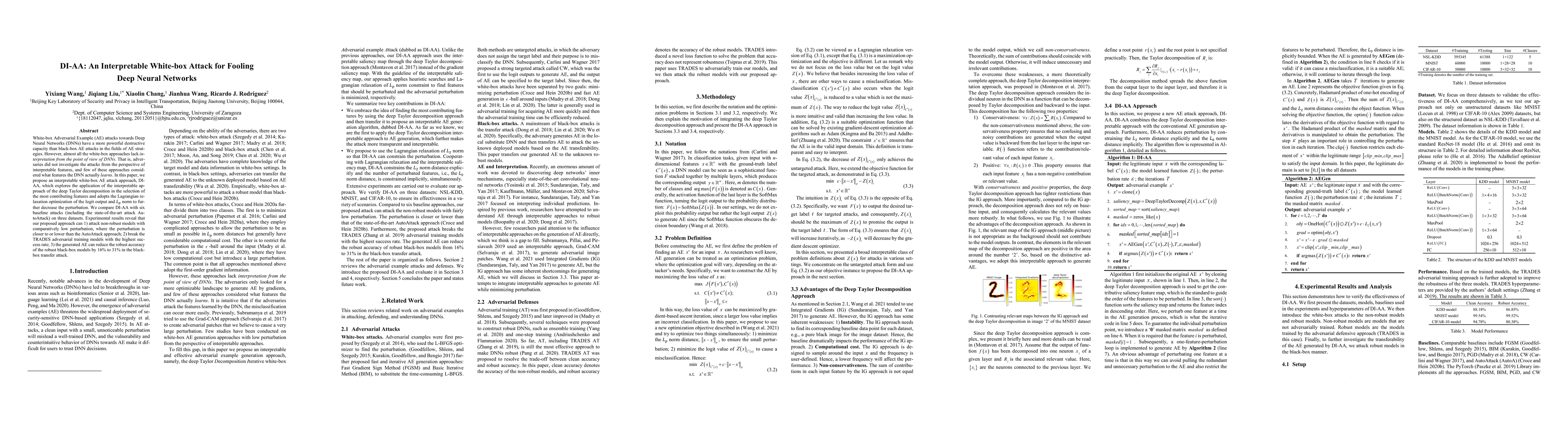 White-box Adversarial Example (AE) attacks towards Deep Neural Networks (DNNs) have a more powerful destructive capacity than black-box AE attacks in the fields of AE strategies. However, almost all the white-box approaches lack interpretation from the point of view of DNNs. That is, adversaries did not investigate the attacks from the perspective of interpretable features, and few of these approaches considered what features the DNN actually learns. In this paper, we propose an interpretable white-box AE attack approach, DI-AA, which explores the application of the interpretable approach of the deep Taylor decomposition in the selection of the most contributing features and adopts the Lagrangian relaxation optimization of the logit output and L_p norm to further decrease the perturbation. We compare DI-AA with six baseline attacks (including the state-of-the-art attack AutoAttack) on three datasets. Experimental results reveal that our proposed approach can 1) attack non-robust models with comparatively low perturbation, where the perturbation is closer to or lower than the AutoAttack approach; 2) break the TRADES adversarial training models with the highest success rate; 3) the generated AE can reduce the robust accuracy of the robust black-box models by 16% to 31% in the black-box transfer attack.