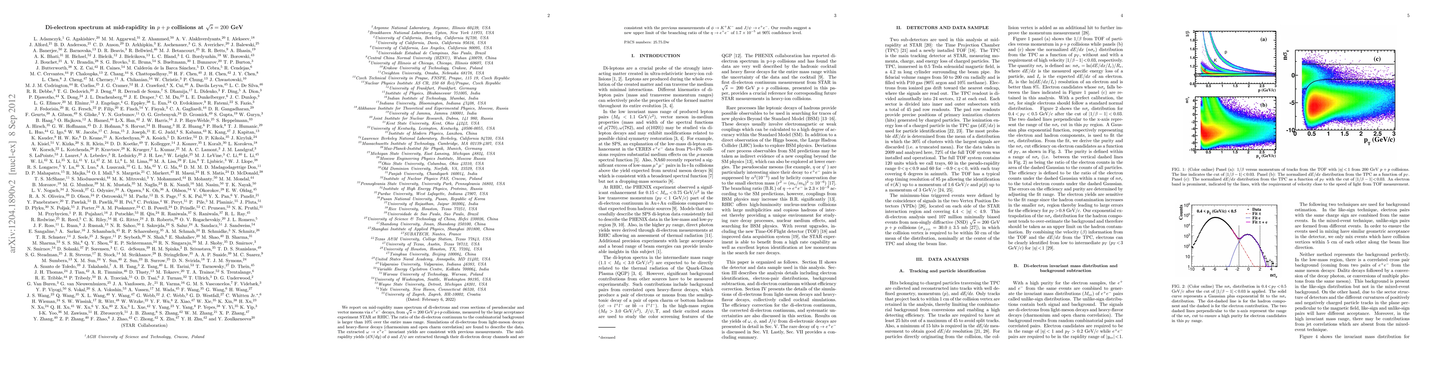 We report on mid-rapidity mass spectrum of di-electrons and cross sections of pseudoscalar and vector mesons via $e^{+}e^{-}$ decays, from $\sqrt{s} = 200$ GeV $p+p$ collisions, measured by the large acceptance experiment STAR at RHIC. The ratio of the di-electron continuum to the combinatorial background is larger than 10% over the entire mass range. Simulations of di-electrons from light-meson decays and heavy-flavor decays (charmonium and open charm correlation) are found to describe the data. The extracted $\omega\rightarrow e^{+}e^{-}$ invariant yields are consistent with previous measurements. The mid-rapidity yields ($dN/dy$) of $\phi$ and $J/\psi$ are extracted through their di-electron decay channels and are consistent with the previous measurements of $\phi\rightarrow K^{+}K^{-}$ and $J/\psi\rightarrow e^{+}e^{-}$. Our results suggest a new upper limit of the branching ratio of the $\eta \rightarrow e^{+}e^{-}$ of $1.7\times10^{-5}$ at 90% confidence level.