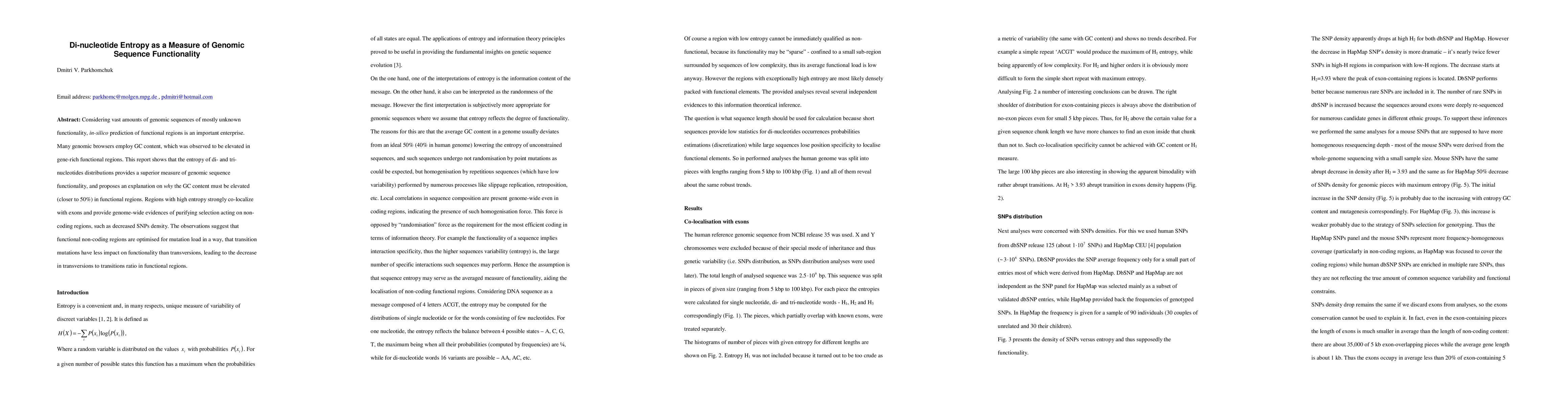 A study found that di-nucleotide entropy is a better measure of genomic sequence functionality than GC content, with regions having high entropy co-localizing with exons. This suggests that functional non-coding regions may be optimized for mutation load in ways that reduce the impact of transversions over transitions.
