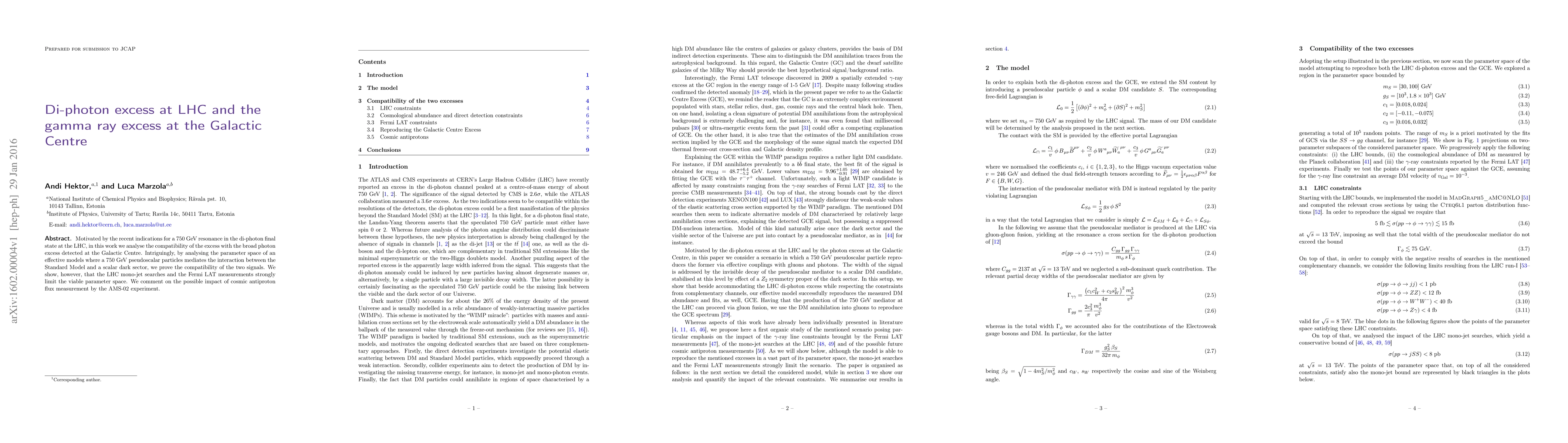 Motivated by the recent indications for a 750 GeV resonance in the di-photon final state at the LHC, in this work we analyse the compatibility of the excess with the broad photon excess detected at the Galactic Centre. Intriguingly, by analysing the parameter space of an effective models where a 750 GeV pseudoscalar particles mediates the interaction between the Standard Model and a scalar dark sector, we prove the compatibility of the two signals. We show, however, that the LHC mono-jet searches and the Fermi LAT measurements strongly limit the viable parameter space. We comment on the possible impact of cosmic antiproton flux measurement by the AMS-02 experiment.