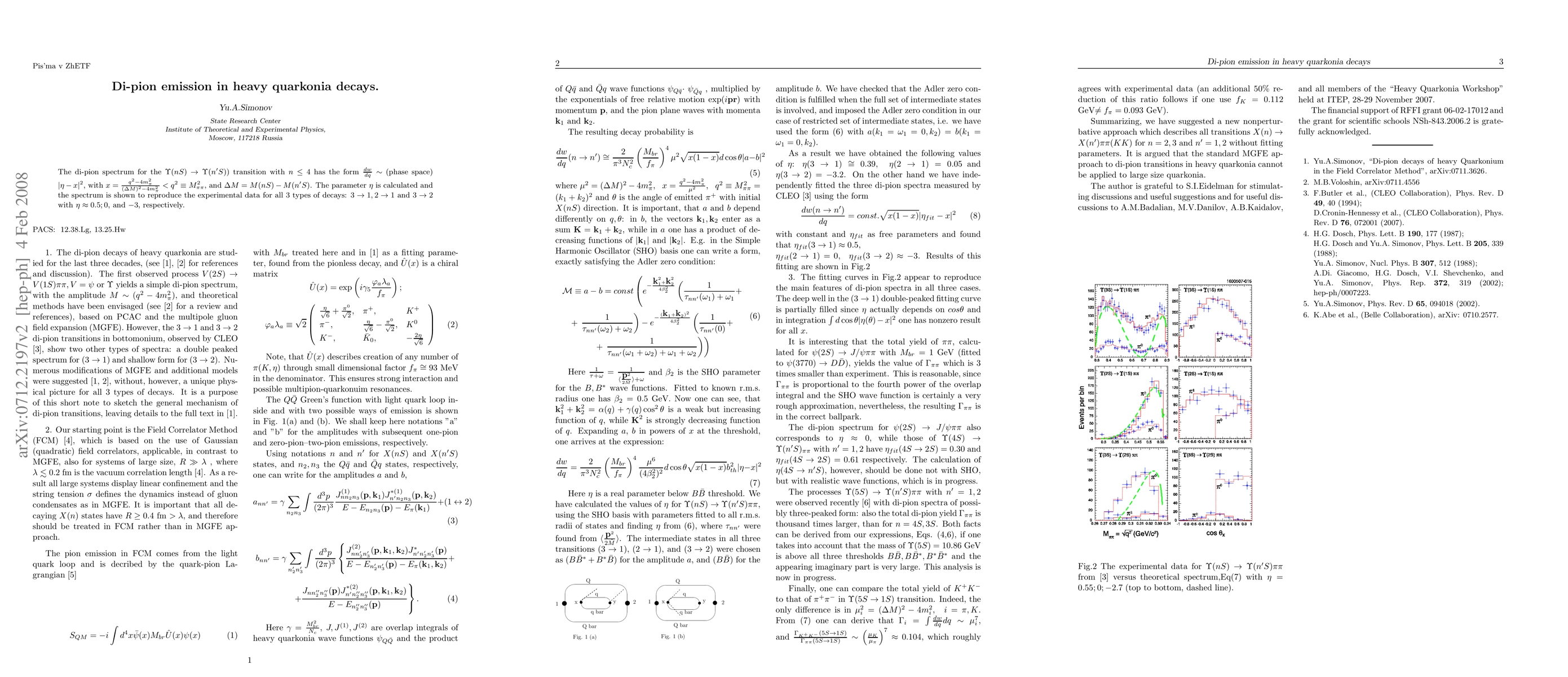 The di-pion spectrum for the $\Upsilon(nS) \to \Upsilon (n'S))$ transition with $n\leq 4$ has the form $\frac{dw}{dq}\sim $ (phase space) $ |\eta-x|^2$, with $x=\frac{q^2-4m^2_\pi}{(\Delta M)^2 -4 m^2_\pi}< q^2 \equiv M^2_{\pi\pi}, $ and $\Delta M=M(nS) -M(n'S)$. The parameter $\eta $ is calculated and the spectrum is shown to reproduce the experimental data for all 3 types of decays: $3\to 1, 2\to 1$ and $3\to 2$ with $\eta \approx 0.5; 0$, and -3, respectively.