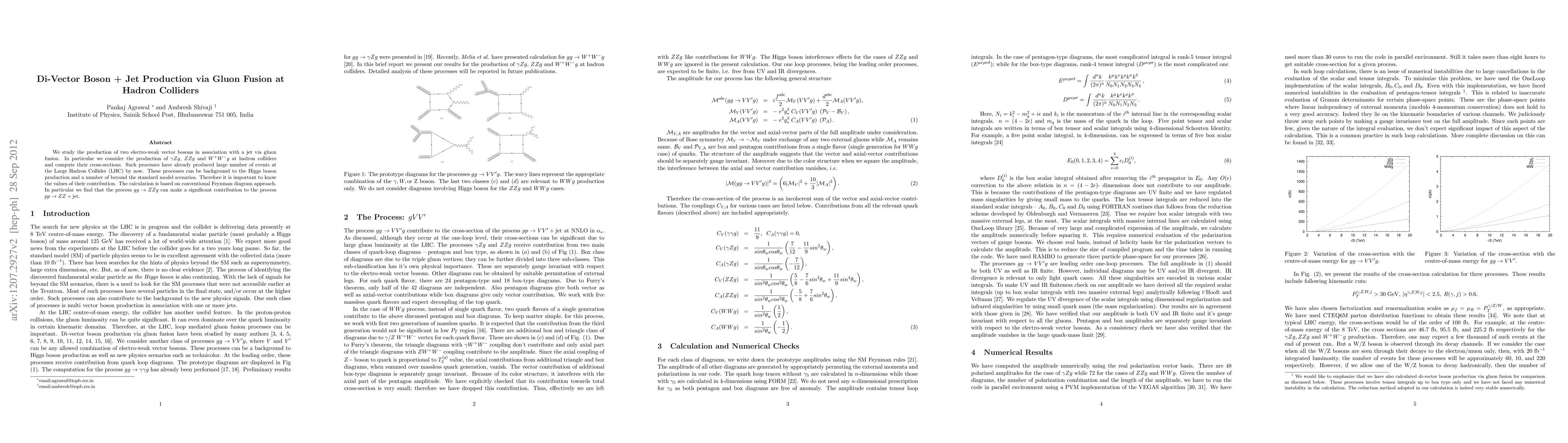 We study the production of two electro-weak vector bosons in association with a jet via gluon fusion. In particular we consider the production of $\gamma Zg$, $ZZg$ and $W^{+}W^{-}g$ at hadron colliders and compute their cross-sections. Such processes have already produced large number of events at the Large Hadron Collider (LHC) by now. These processes can be background to the Higgs boson production and a number of beyond the standard model scenarios. Therefore it is important to know the values of their contribution. The calculation is based on conventional Feynman diagram approach. In particular we find that the process $g g \to Z Z g$ can make a significant contribution to the process $p p \to Z Z + {\rm jet}$.