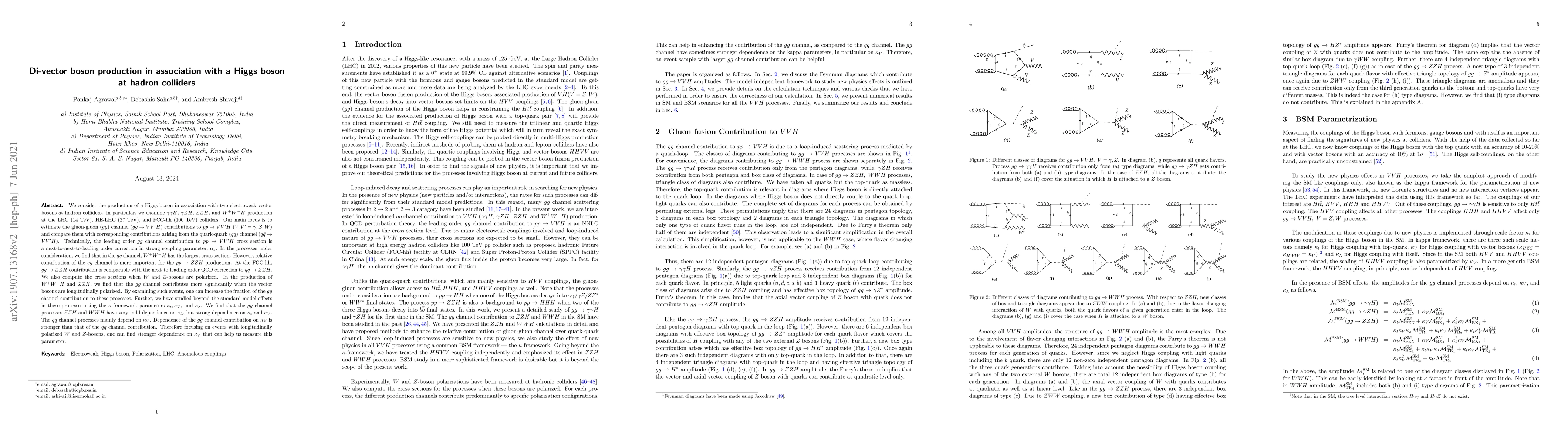 We consider the production of a Higgs boson in association with two electroweak vector bosons at hadron colliders. In particular, we examine $\gamma\gamma H$, $\gamma ZH$, $ZZH$, and $W^{+}W^{-}H$ production at the LHC (14 TeV), HE-LHC (27 TeV), and FCC-hh (100 TeV) colliders. Our main focus is to estimate the gluon-gluon ($gg$) channel ($gg \to VV^\prime H$) contributions to $pp \to VV^\prime H~(V,V^\prime=\gamma,Z,W)$ and compare them with corresponding contributions arising from the quark-quark ($qq$) channel. Technically, the leading order $gg$ channel contribution to $pp \to VV^\prime H$ cross section is an NNLO correction in $\alpha_s$. In the processes under consideration, we find that in the $gg$ channel, $W^{+}W^{-}H$ has the largest cross section. However, relative contribution of the $gg$ channel is more important for the $pp \to ZZH$ production. At the FCC-hh, $gg \to ZZH$ contribution is comparable with the NLO QCD correction to $qq \to ZZH$. We also compute the cross sections when $W$ and $Z$-bosons are polarized. In the production of $W^{+}W^{-}H$ and $ZZH$, we find that the $gg$ channel contributes more significantly when the vector bosons are longitudinally polarized. By examining such events, one can increase the fraction of the $gg$ channel contribution to these processes. Further, we have studied beyond-the-standard-model effects in the $\kappa$-framework. We find that the $gg$ channel processes $ZZH$ and $WWH$ have very mild dependence on $\kappa_\lambda$, but strong dependence on $\kappa_t$ and $\kappa_V$. The $qq$ channel processes mainly depend on $\kappa_V$. Dependence of the $gg$ channel contribution on $\kappa_V$ is stronger than that of the $qq$ channel contribution. Therefore focusing on events with longitudinally polarized $W$ and $Z$-bosons, one can find stronger dependence on $\kappa_V$ that can help us measure this parameter.