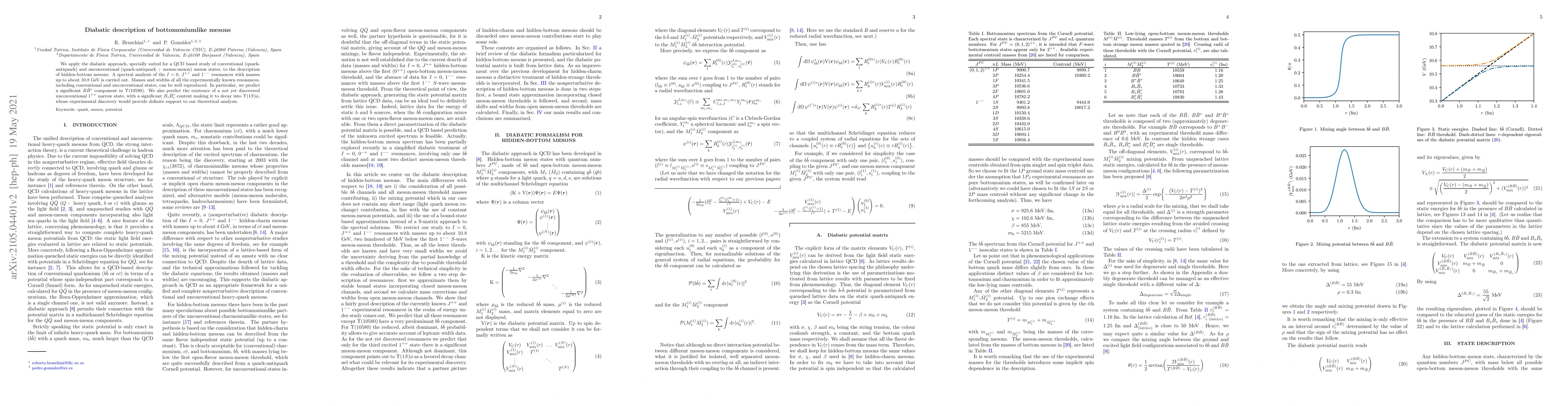 We apply the diabatic approach, specially suited for a QCD based study of conventional (quark-antiquark) and unconventional (quark-antiquark + meson-meson) meson states, to the description of hidden-bottom mesons. A spectral analysis of the $I=0$, $J^{++}$ and $1^{--}$ resonances with masses up to about $10.8$ GeV is carried out. Masses and widths of all the experimentally known resonances, including conventional and unconventional states, can be well reproduced. In particular, we predict a significant $B\bar{B}^{\ast}$ component in $\Upsilon(10580)$. We also predict the existence of a not yet discovered unconventional $1^{++}$ narrow state, with a significant $B_{s}\bar{B}_{s}^{\ast}$ content making it to decay into $\Upsilon(1S)\phi$, whose experimental discovery would provide definite support to our theoretical analysis.
