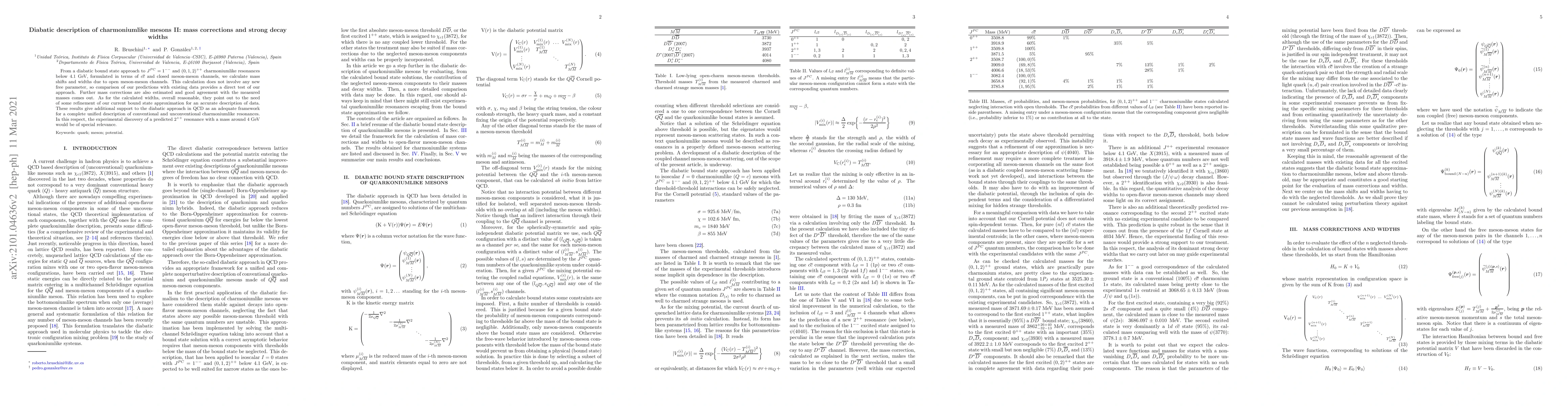 From a diabatic bound state approach to $J^{PC}=1^{--}$ and $(0,1,2)^{++}$ charmoniumlike resonances below $4.1$ GeV, formulated in terms of ${c\overline{c}}$ and closed meson-meson channels, we calculate mass shifts and widths due to open meson-meson channels. This calculation does not involve any new free parameter, so comparison of our predictions with existing data provides a direct test of our approach. Further mass corrections are also estimated and good agreement with the measured masses comes out. As for the calculated widths, overall reasonable, they point out to the need of some refinement of our current bound state approximation for an accurate description of data. These results give additional support to the diabatic approach in QCD as an adequate framework for a complete unified description of conventional and unconventional charmoniumlike resonances. In this respect, the experimental discovery of a predicted $2^{++}$ resonance with a mass around $4$ GeV would be of special relevance.