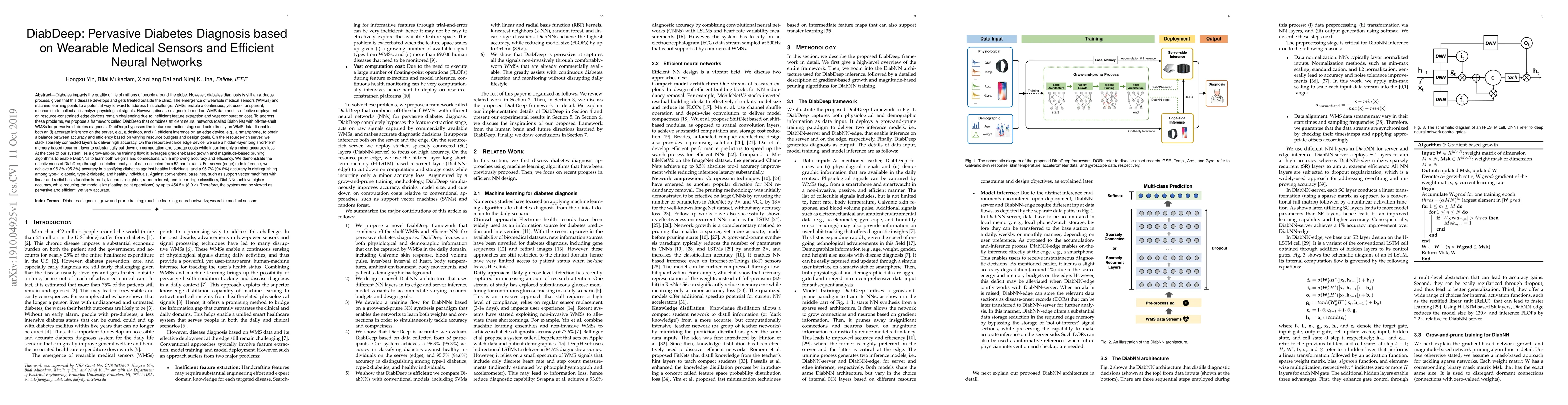 A new framework called DiabDeep combines efficient neural networks with wearable medical sensors to diagnose diabetes more accurately and efficiently, achieving 96.3% accuracy in classifying diabetics and reducing model size by up to 454.5x.