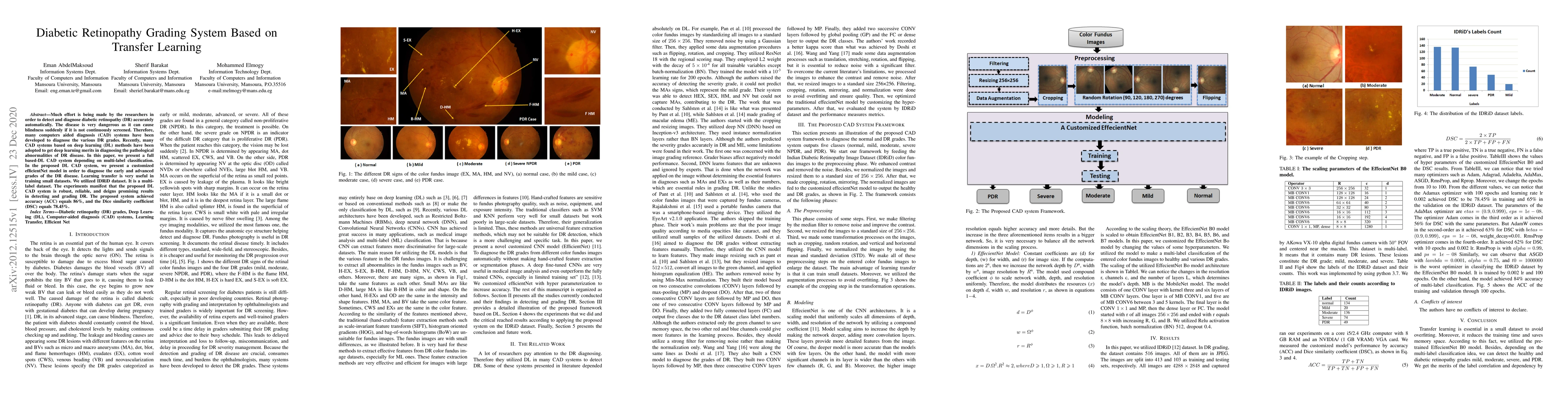 Much effort is being made by the researchers in order to detect and diagnose diabetic retinopathy (DR) accurately automatically. The disease is very dangerous as it can cause blindness suddenly if it is not continuously screened. Therefore, many computers aided diagnosis (CAD) systems have been developed to diagnose the various DR grades. Recently, many CAD systems based on deep learning (DL) methods have been adopted to get deep learning merits in diagnosing the pathological abnormalities of DR disease. In this paper, we present a full based-DL CAD system depending on multi-label classification. In the proposed DL CAD system, we present a customized efficientNet model in order to diagnose the early and advanced grades of the DR disease. Learning transfer is very useful in training small datasets. We utilized IDRiD dataset. It is a multi-label dataset. The experiments manifest that the proposed DL CAD system is robust, reliable, and deigns promising results in detecting and grading DR. The proposed system achieved accuracy (ACC) equals 86%, and the Dice similarity coefficient (DSC) equals 78.45.