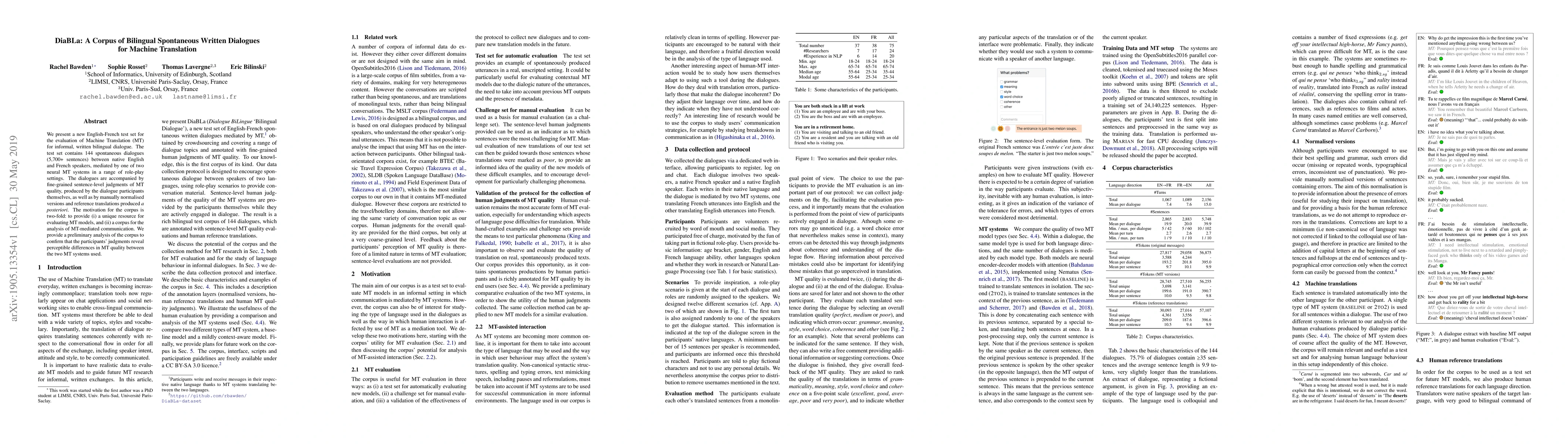 DiaBLa is a new English-French corpus of 144 spontaneous written dialogues for evaluating machine translation models, featuring judgments from participants and reference translations. The corpus aims to assess translation quality and analyze MT-mediated communication, revealing differences in translation quality between the involved systems.
