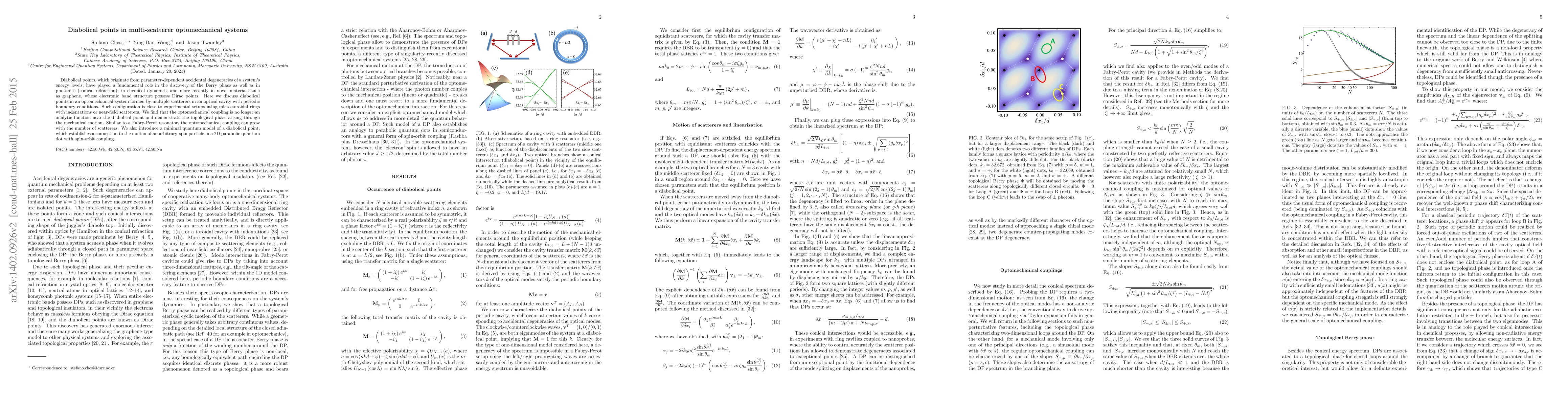 This paper explores diabolical points in multi-scatterer optomechanical systems, demonstrating that optomechanical coupling becomes non-analytic near these points and revealing a topological phase arising from mechanical motion. The study connects these phenomena to a minimal quantum model involving an arbitrary-spin particle in a 2D parabolic quantum dot with spin-orbit coupling.