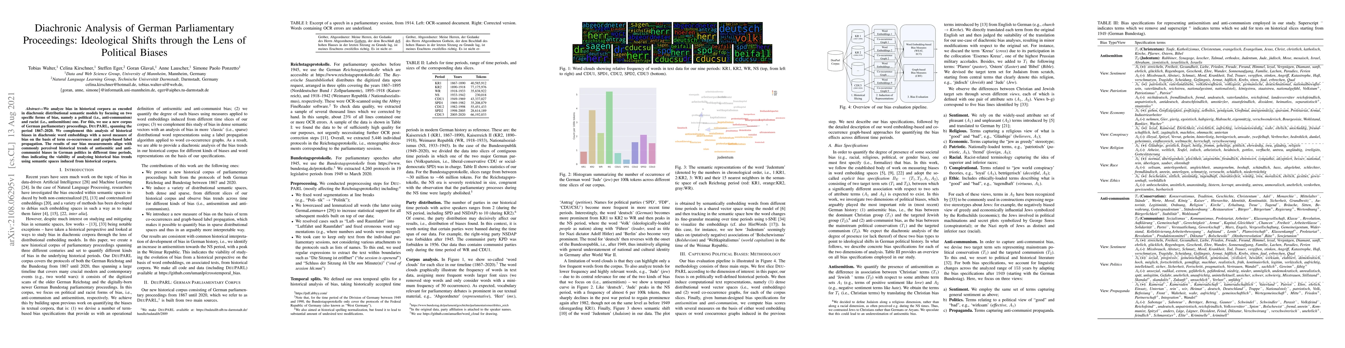 This research analyzes biases in German parliamentary proceedings from 1867 to 2020 using diachronic distributional semantic models, confirming historical trends of antisemitic and anti-communist biases.