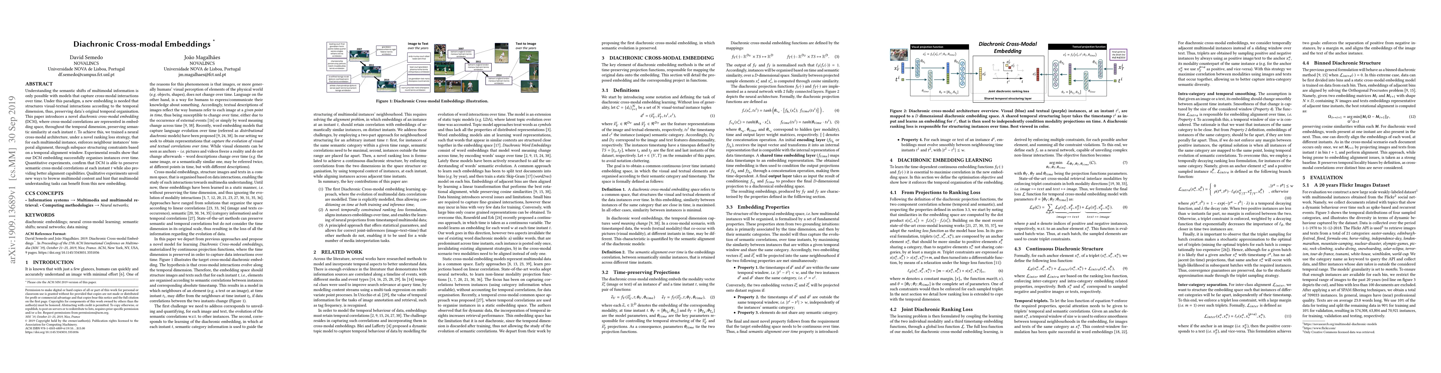 Understanding the semantic shifts of multimodal information is only possible with models that capture cross-modal interactions over time. Under this paradigm, a new embedding is needed that structures visual-textual interactions according to the temporal dimension, thus, preserving data's original temporal organisation. This paper introduces a novel diachronic cross-modal embedding (DCM), where cross-modal correlations are represented in embedding space, throughout the temporal dimension, preserving semantic similarity at each instant t. To achieve this, we trained a neural cross-modal architecture, under a novel ranking loss strategy, that for each multimodal instance, enforces neighbour instances' temporal alignment, through subspace structuring constraints based on a temporal alignment window. Experimental results show that our DCM embedding successfully organises instances over time. Quantitative experiments, confirm that DCM is able to preserve semantic cross-modal correlations at each instant t while also providing better alignment capabilities. Qualitative experiments unveil new ways to browse multimodal content and hint that multimodal understanding tasks can benefit from this new embedding.