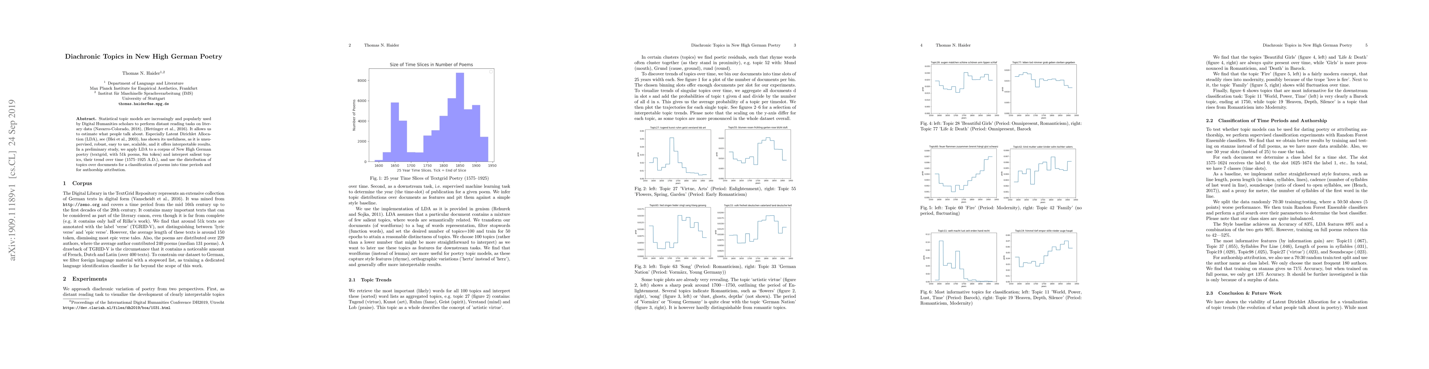 Statistical topic models are increasingly and popularly used by Digital Humanities scholars to perform distant reading tasks on literary data. It allows us to estimate what people talk about. Especially Latent Dirichlet Allocation (LDA) has shown its usefulness, as it is unsupervised, robust, easy to use, scalable, and it offers interpretable results. In a preliminary study, we apply LDA to a corpus of New High German poetry (textgrid, with 51k poems, 8m token), and use the distribution of topics over documents for a classification of poems into time periods and for authorship attribution.