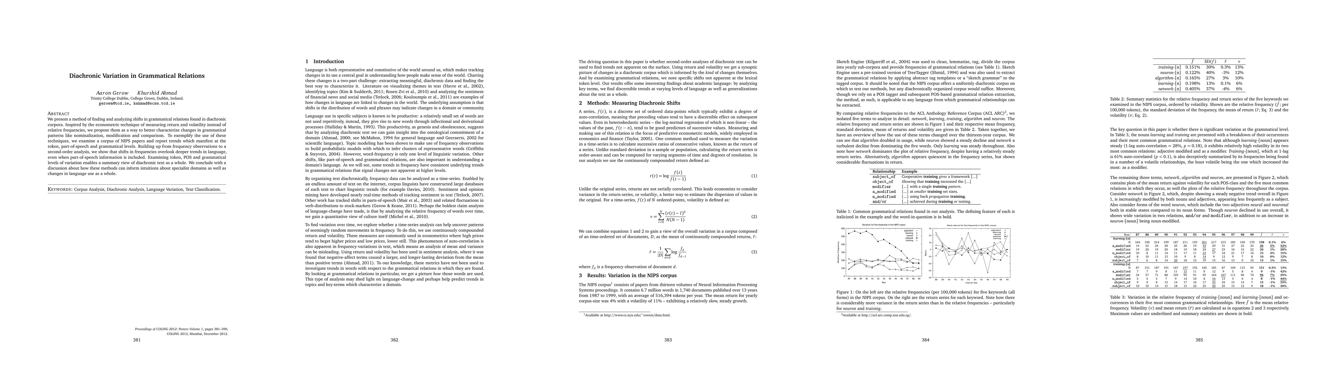 We present a method of finding and analyzing shifts in grammatical relations found in diachronic corpora. Inspired by the econometric technique of measuring return and volatility instead of relative frequencies, we propose them as a way to better characterize changes in grammatical patterns like nominalization, modification and comparison. To exemplify the use of these techniques, we examine a corpus of NIPS papers and report trends which manifest at the token, part-of-speech and grammatical levels. Building up from frequency observations to a second-order analysis, we show that shifts in frequencies overlook deeper trends in language, even when part-of-speech information is included. Examining token, POS and grammatical levels of variation enables a summary view of diachronic text as a whole. We conclude with a discussion about how these methods can inform intuitions about specialist domains as well as changes in language use as a whole.