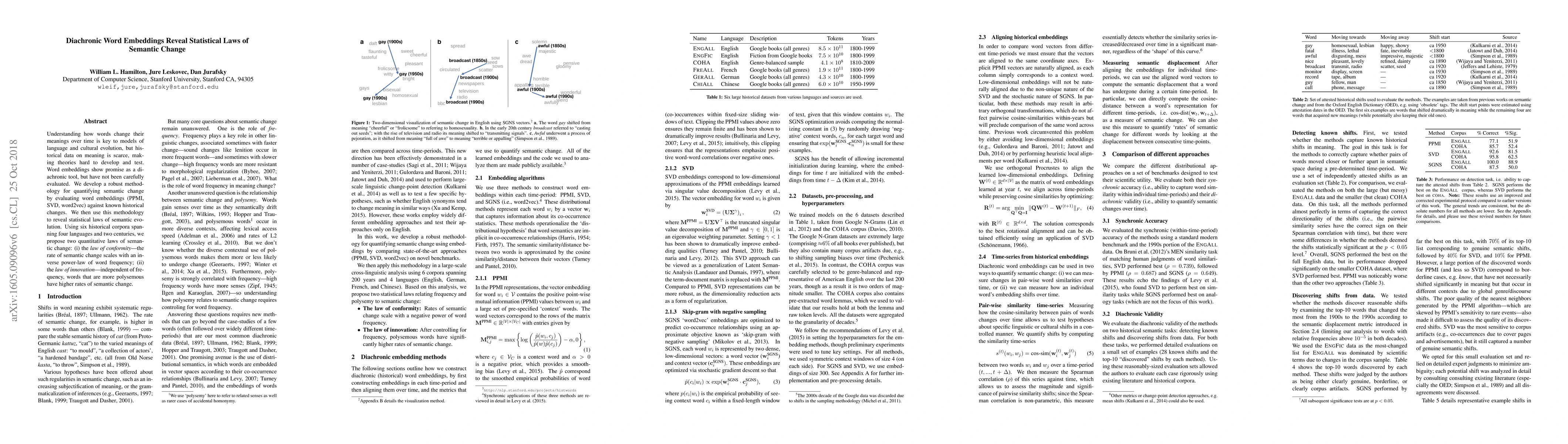 This paper develops a robust methodology to quantify semantic change using diachronic word embeddings, revealing statistical laws of semantic evolution. It identifies two key laws: the law of conformity, where the rate of change inversely scales with word frequency, and the law of innovation, where polysemous words experience higher rates of change regardless of frequency.