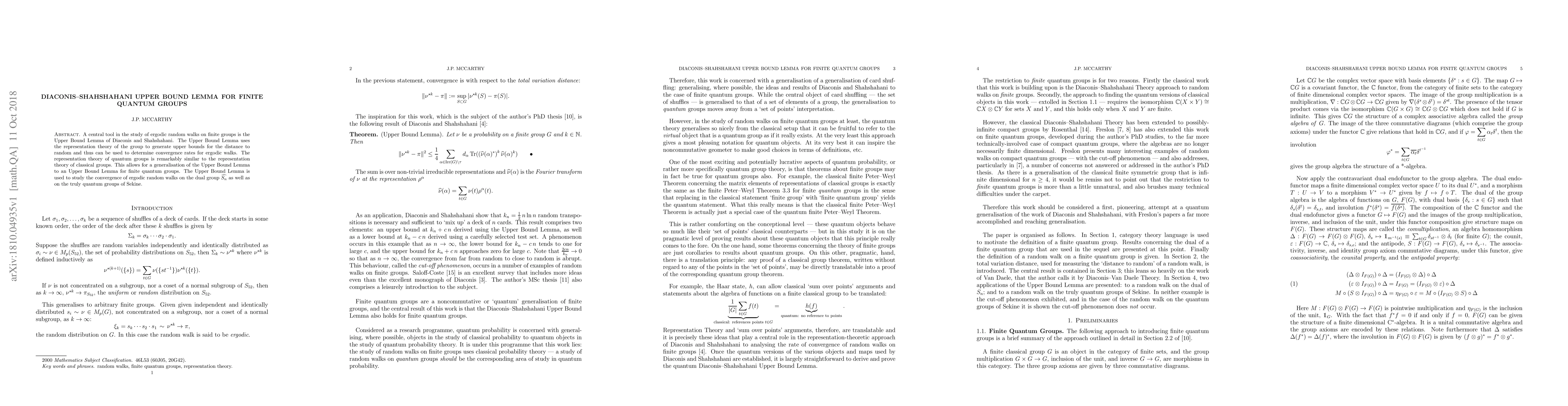 The paper generalizes the Diaconis-Shahshahani Upper Bound Lemma from classical to finite quantum groups, using their similar representation theories, to determine convergence rates for ergodic random walks on these quantum groups. This includes applications to the dual symmetric group $\widehat{S_n}$ and quantum groups of Sekine.