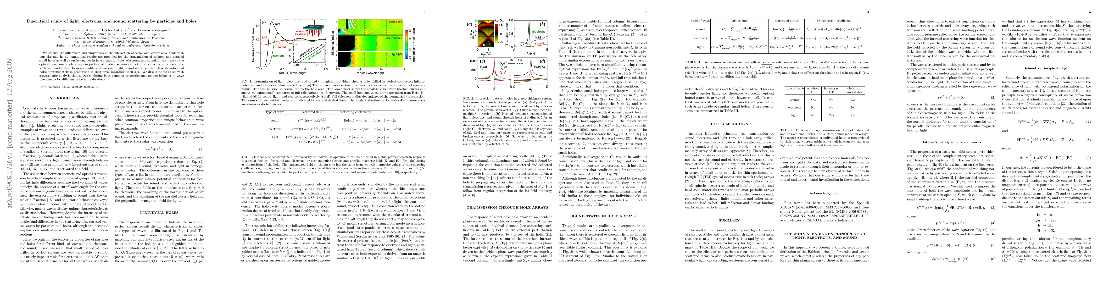 We discuss the differences and similarities in the interaction of scalar and vector wave-fields with particles and holes. Analytical results are provided for the transmission of isolated and arrayed small holes as well as surface modes in hole arrays for light, electrons, and sound. In contrast to the optical case, small-hole arrays in perforated perfect screens cannot produce acoustic or electronic surface-bound states. However, unlike electrons and light, sound is transmitted through individual holes approximately in proportion to their area, regardless their size. We discuss these issues with a systematic analysis that allows exploring both common properties and unique behavior in wave phenomena for different material realizations.