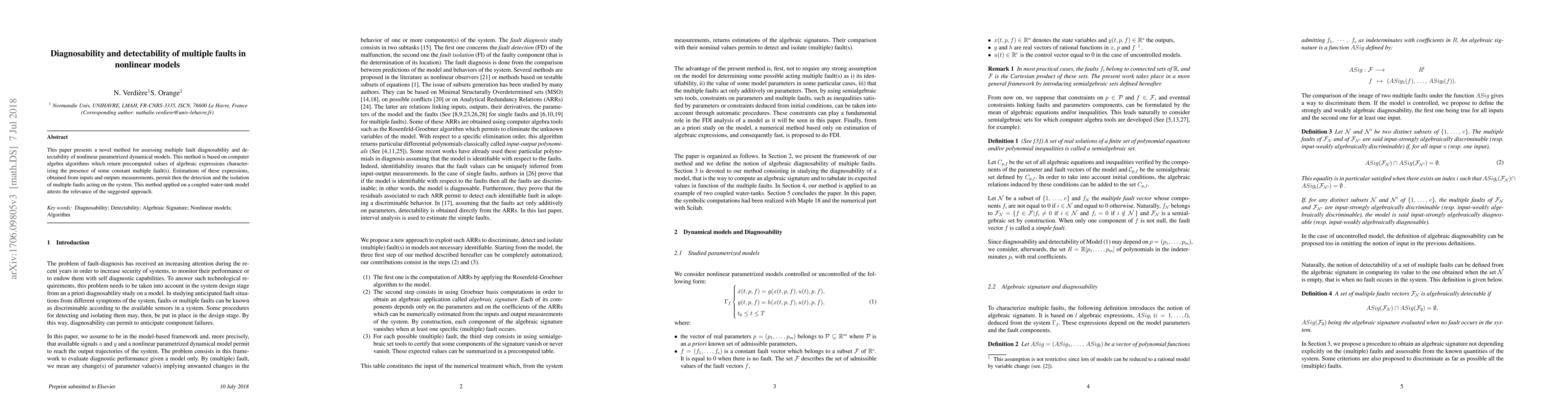 This paper introduces a new method for evaluating multiple fault diagnosability and detectability in nonlinear dynamical models using computer algebra algorithms. The method successfully identifies and isolates faults in a coupled water-tank model, demonstrating its effectiveness.