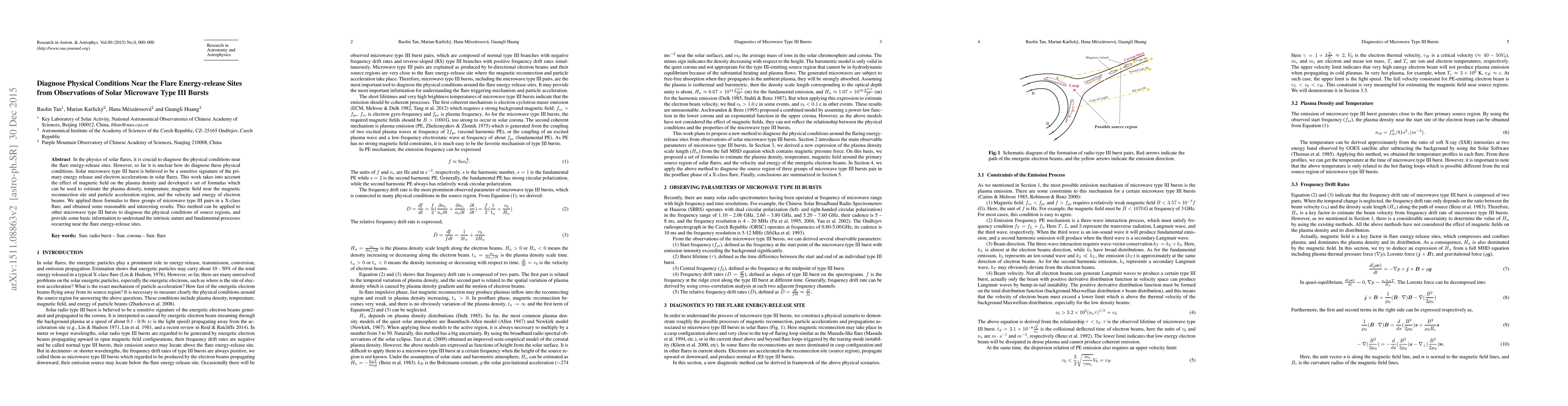 In the physics of solar flares, it is crucial to diagnose the physical conditions near the flare energy-release sites. However, so far it is unclear how do diagnose these physical conditions. Solar microwave type III burst is believed to be a sensitive signature of the primary energy release and electron accelerations in solar flares. This work takes into account the effect of magnetic field on the plasma density and developed s set of formulas which can be used to estimate the plasma density, temperature, magnetic field near the magnetic reconnection site and particle acceleration region, and the velocity and energy of electron beams. We applied these formulas to three groups of microwave type III pairs in a X-class flare, and obtained some reasonable and interesting results. This method can be applied to other microwave type III bursts to diagnose the physical conditions of source regions, and provide some basic information to understand the intrinsic nature and fundamental processes occurring near the flare energy-release sites.