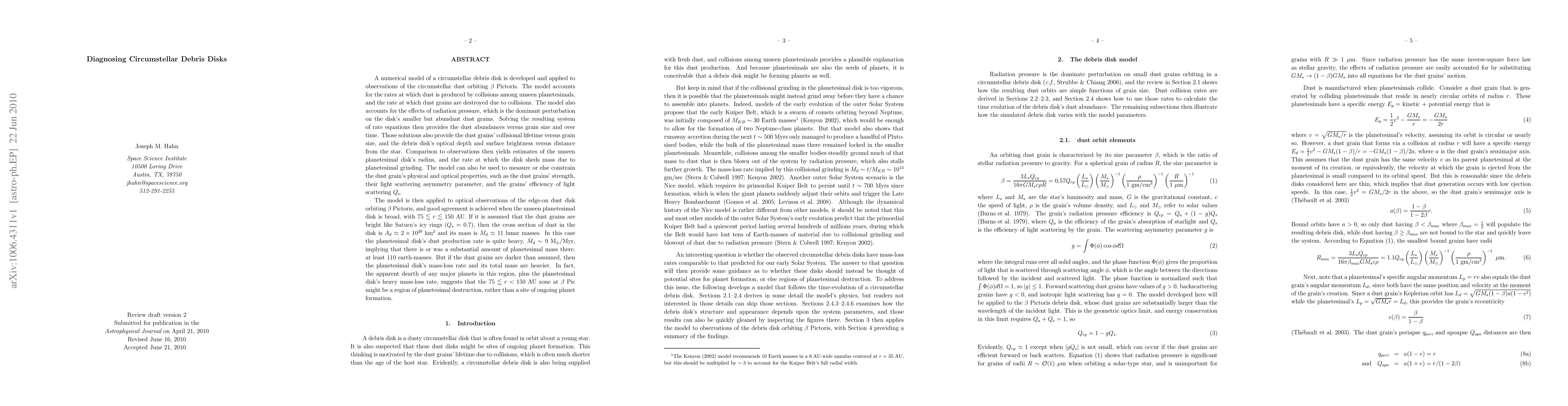 This paper develops a numerical model to analyze circumstellar debris disks, specifically applied to beta Pictoris. The model estimates the planetesimal disk's radius and mass-loss rate, suggesting a region of significant planetesimal destruction rather than ongoing planet formation.