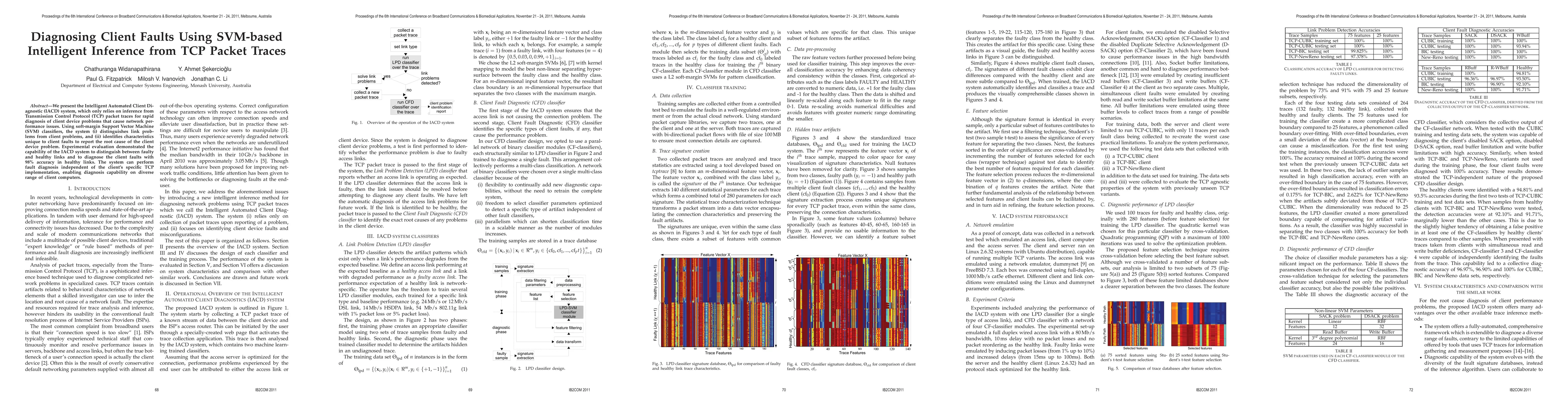 The Intelligent Automated Client Diagnostic (IACD) system uses SVM classifiers to diagnose client device faults from TCP packet traces, distinguishing them from link problems and achieving 98% accuracy in healthy links. The system diagnoses faults independently of the specific TCP implementation, providing a versatile diagnostic tool.