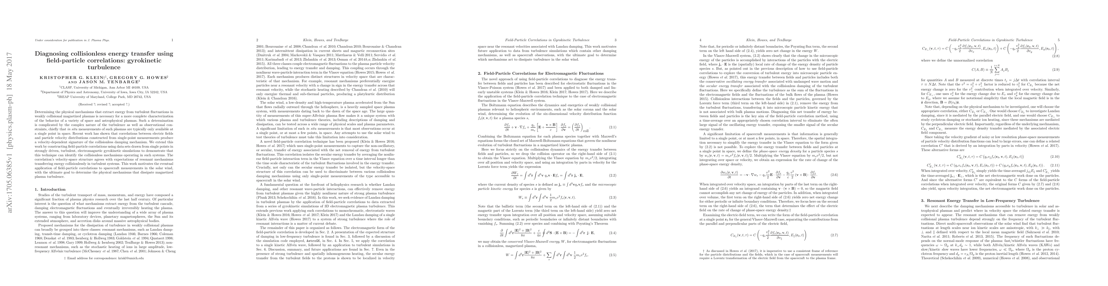 This paper investigates the use of field-particle correlations from gyrokinetic simulations to diagnose collisionless energy transfer in turbulent magnetized plasmas. The study demonstrates that these correlations can identify the underlying mechanisms of energy dissipation in such systems, paving the way for future applications to in situ spacecraft measurements in the solar wind.