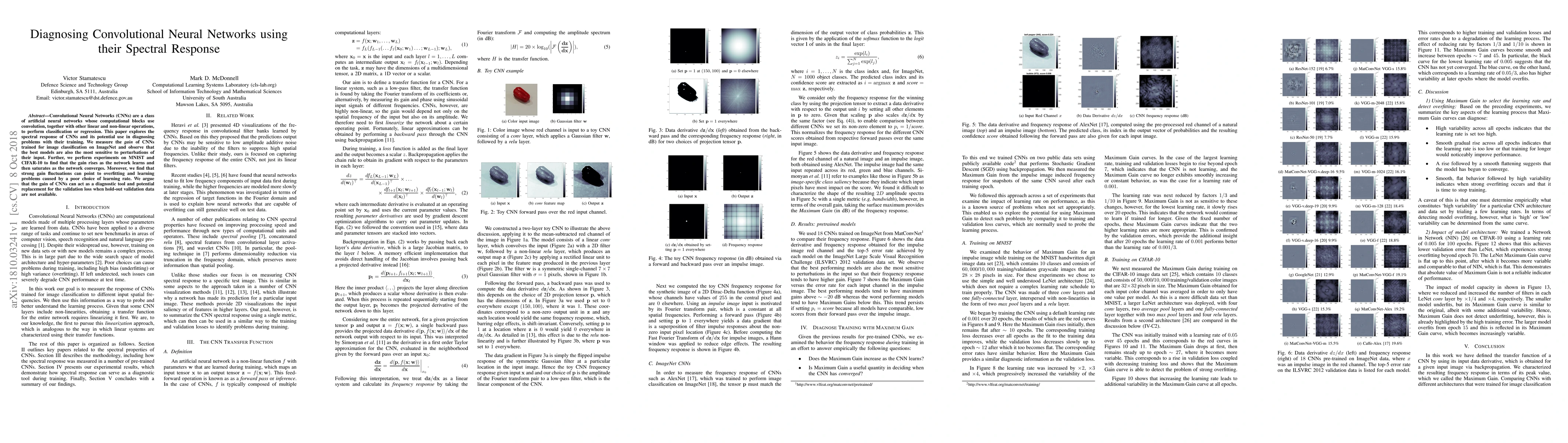Convolutional Neural Networks (CNNs) are a class of artificial neural networks whose computational blocks use convolution, together with other linear and non-linear operations, to perform classification or regression. This paper explores the spectral response of CNNs and its potential use in diagnosing problems with their training. We measure the gain of CNNs trained for image classification on ImageNet and observe that the best models are also the most sensitive to perturbations of their input. Further, we perform experiments on MNIST and CIFAR-10 to find that the gain rises as the network learns and then saturates as the network converges. Moreover, we find that strong gain fluctuations can point to overfitting and learning problems caused by a poor choice of learning rate. We argue that the gain of CNNs can act as a diagnostic tool and potential replacement for the validation loss when hold-out validation data are not available.