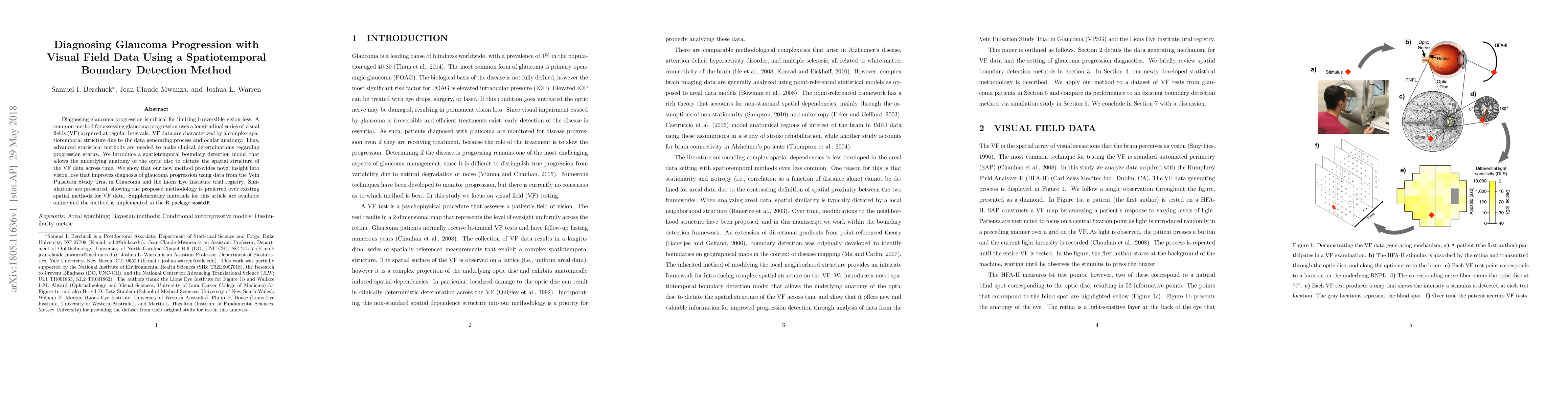 This paper introduces a spatiotemporal boundary detection method for diagnosing glaucoma progression using visual field data, showing improved diagnosis compared to existing spatial methods. The proposed method leverages the underlying anatomy of the optic disc to better understand vision loss, demonstrated through trials and simulations.