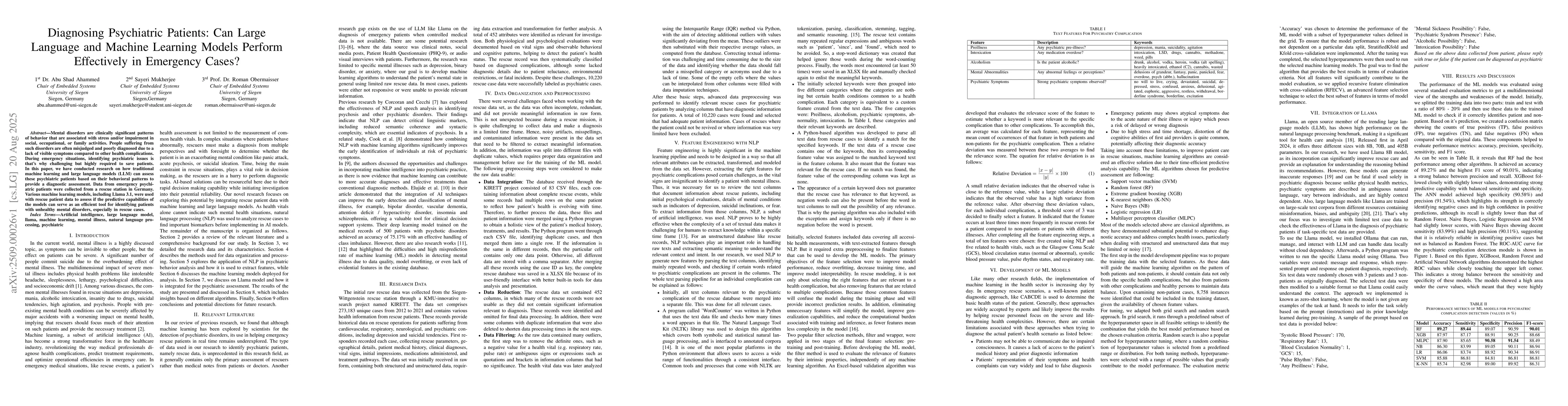 Mental disorders are clinically significant patterns of behavior that are associated with stress and/or impairment in social, occupational, or family activities. People suffering from such disorders are often misjudged and poorly diagnosed due to a lack of visible symptoms compared to other health complications. During emergency situations, identifying psychiatric issues is that's why challenging but highly required to save patients. In this paper, we have conducted research on how traditional machine learning and large language models (LLM) can assess these psychiatric patients based on their behavioral patterns to provide a diagnostic assessment. Data from emergency psychiatric patients were collected from a rescue station in Germany. Various machine learning models, including Llama 3.1, were used with rescue patient data to assess if the predictive capabilities of the models can serve as an efficient tool for identifying patients with unhealthy mental disorders, especially in rescue cases.