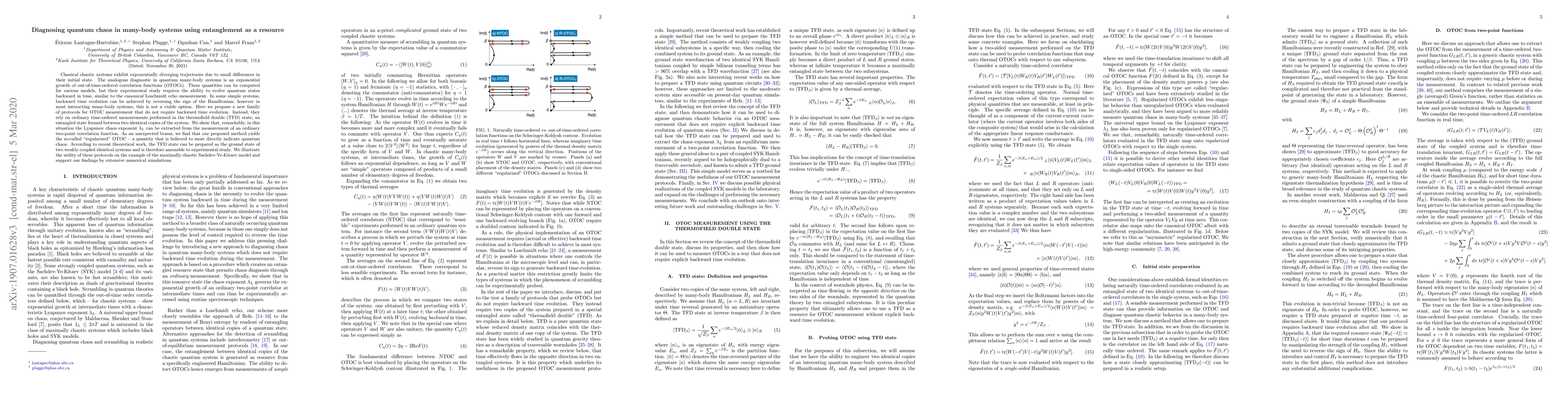 Classical chaotic systems exhibit exponentially diverging trajectories due to small differences in their initial state. The analogous diagnostic in quantum many-body systems is an exponential growth of out-of-time-ordered correlation functions (OTOCs). These quantities can be computed for various models, but their experimental study requires the ability to evolve quantum states backward in time, similar to the canonical Loschmidt echo measurement. In some simple systems, backward time evolution can be achieved by reversing the sign of the Hamiltonian; however in most interacting many-body systems, this is not a viable option. Here we propose a new family of protocols for OTOC measurement that do not require backward time evolution. Instead, they rely on ordinary time-ordered measurements performed in the thermofield double (TFD) state, an entangled state formed between two identical copies of the system. We show that, remarkably, in this situation the Lyapunov chaos exponent $\lambda_L$ can be extracted from the measurement of an ordinary two-point correlation function. As an unexpected bonus, we find that our proposed method yields the so-called "regularized" OTOC -- a quantity that is believed to most directly indicate quantum chaos. According to recent theoretical work, the TFD state can be prepared as the ground state of two weakly coupled identical systems and is therefore amenable to experimental study. We illustrate the utility of these protocols on the example of the maximally chaotic Sachdev-Ye-Kitaev model and support our findings by extensive numerical simulations.
