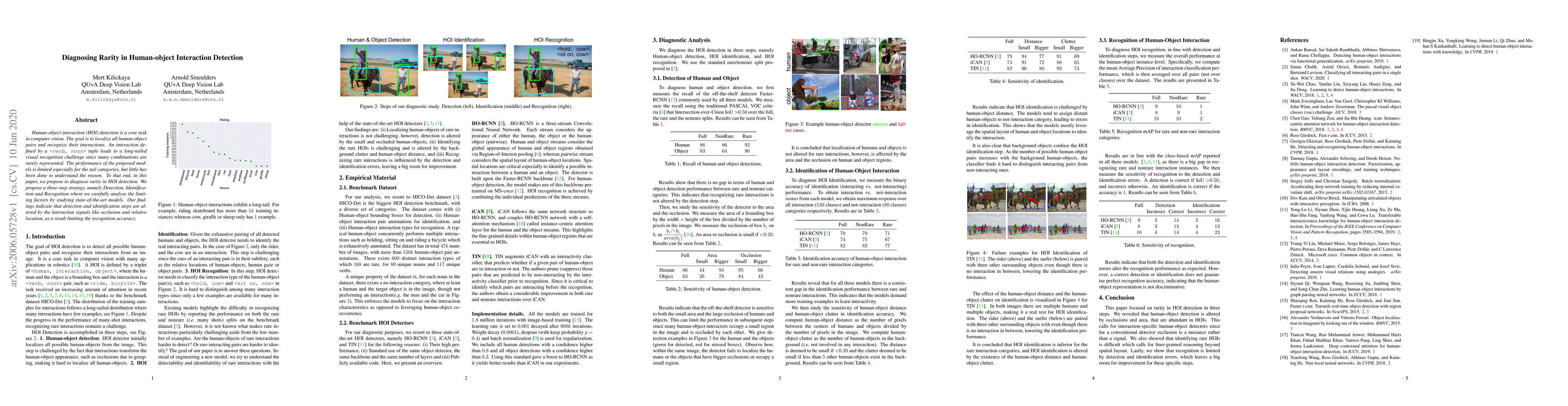 This paper proposes a three-step strategy to diagnose rarity in human-object interaction detection, revealing that detection and identification are hindered by interaction signals like occlusion and relative location, which limit recognition accuracy. The study aims to understand the performance challenges faced by state-of-the-art models, especially for rare interaction categories.