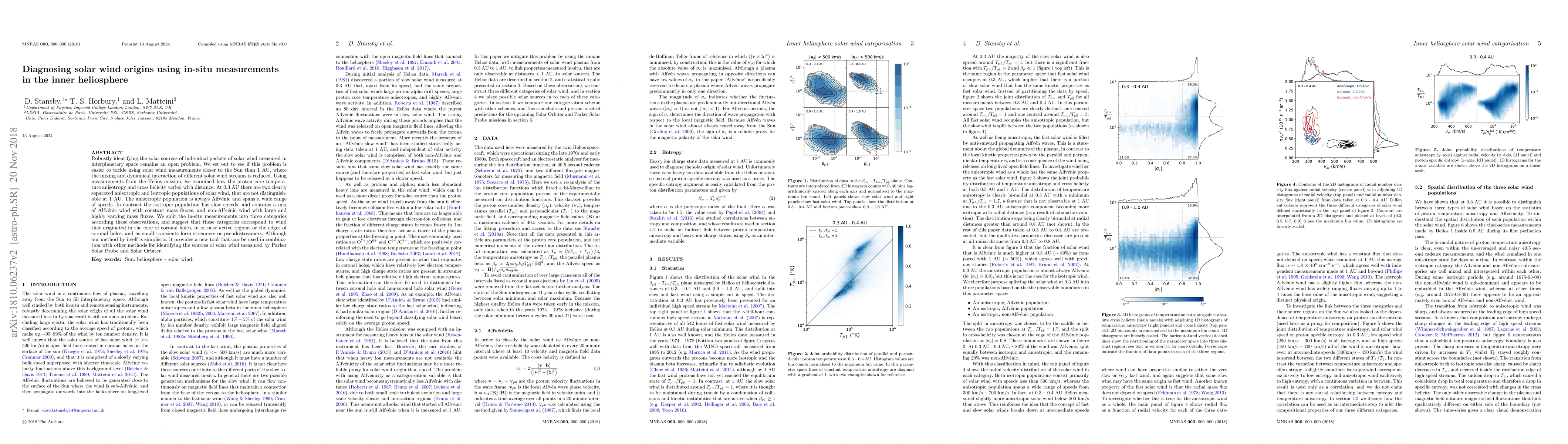Robustly identifying the solar sources of individual packets of solar wind measured in interplanetary space remains an open problem. We set out to see if this problem is easier to tackle using solar wind measurements closer to the Sun than 1 AU, where the mixing and dynamical interaction of different solar wind streams is reduced. Using measurements from the Helios mission, we examined how the proton core temperature anisotropy and cross helicity varied with distance. At 0.3 AU there are two clearly separated anisotropic and isotropic populations of solar wind, that are not distinguishable at 1 AU. The anisotropic population is always Alfv\'enic and spans a wide range of speeds. In contrast the isotropic population has slow speeds, and contains a mix of Alfv\'enic wind with constant mass fluxes, and non-Alfv\'enic wind with large and highly varying mass fluxes. We split the in-situ measurements into three categories according these observations, and suggest that these categories correspond to wind that originated in the core of coronal holes, in or near active regions or the edges of coronal holes, and as small transients form streamers or pseudostreamers. Although our method by itself is simplistic, it provides a new tool that can be used in combination with other methods for identifying the sources of solar wind measured by Parker Solar Probe and Solar Orbiter.