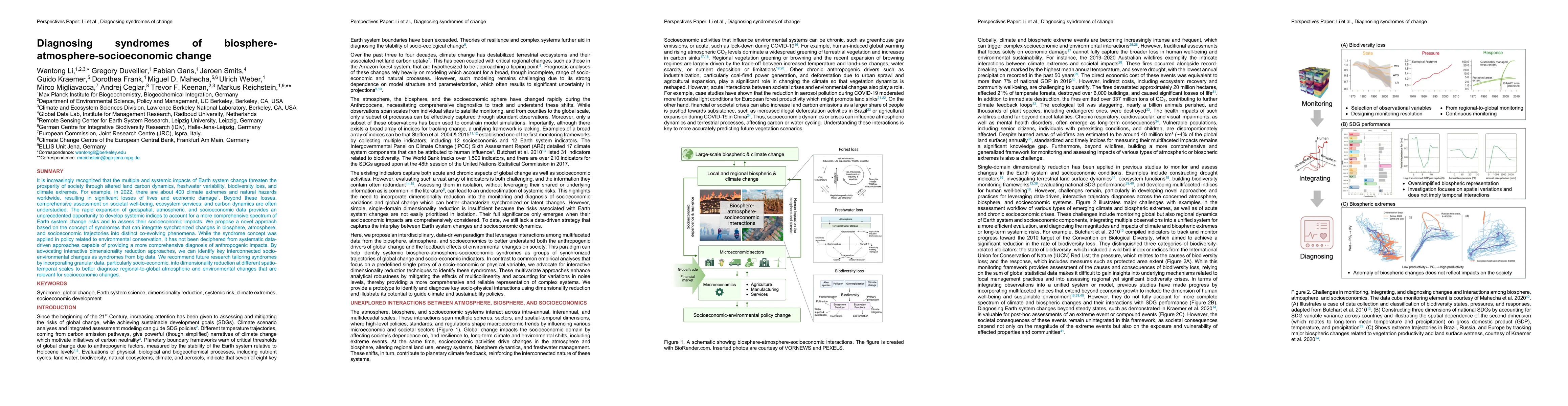 This paper proposes a novel approach to diagnose syndromes of biosphere-atmosphere-socioeconomic changes using interactive dimensionality reduction from big data. It emphasizes the need for comprehensive indices to assess Earth system change risks and their socioeconomic impacts, advocating for granular socio-economic data to better diagnose regional-to-global environmental changes.