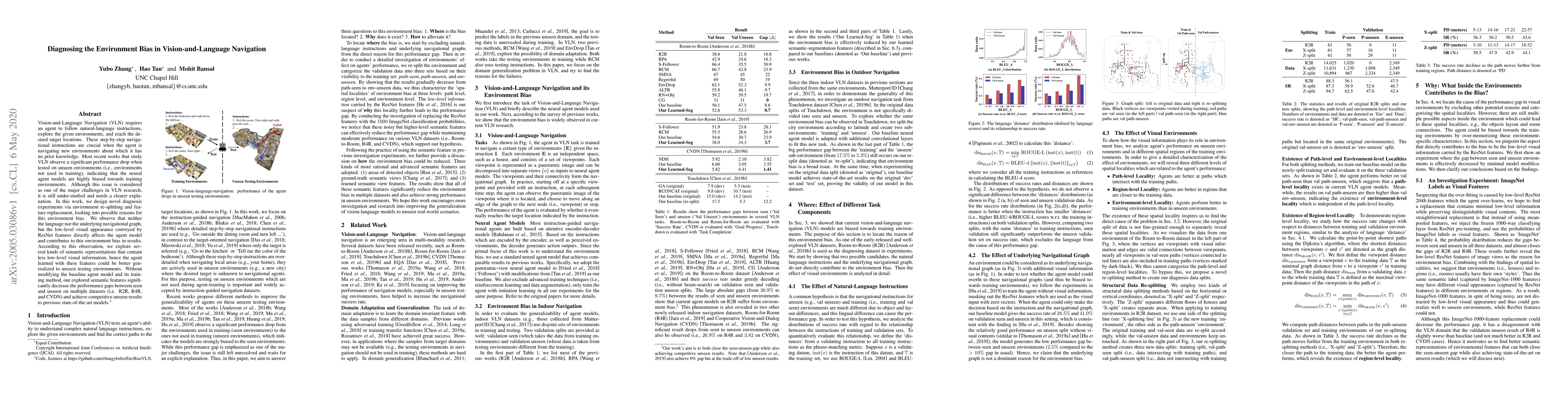 This research paper diagnoses the environment bias in vision-and-language navigation, finding that low-level visual appearance conveyed by ResNet features is a key contributor to this issue, and proposes new semantic representations with reduced visual information to improve generalization to unseen environments.