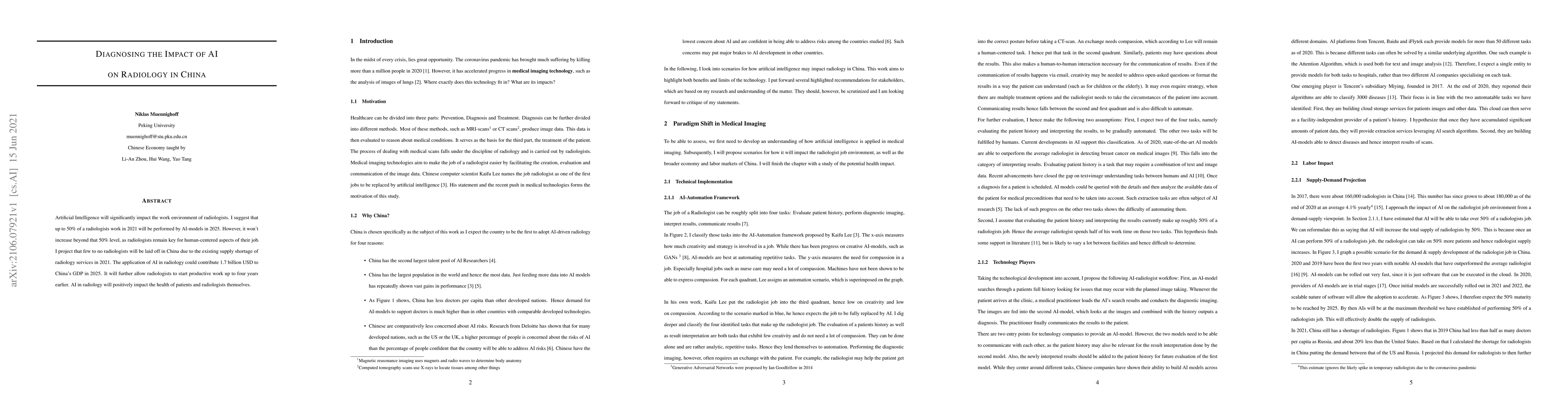 Summary: This study projects that AI will significantly augment radiology in China, with up to 50% of radiologists' work being performed by AI models by 2025, while maintaining human-centered roles. The integration of AI is expected to contribute $1.7 billion to China's GDP and enhance both patient and radiologist health, without causing layoffs due to the existing shortage of radiology services.